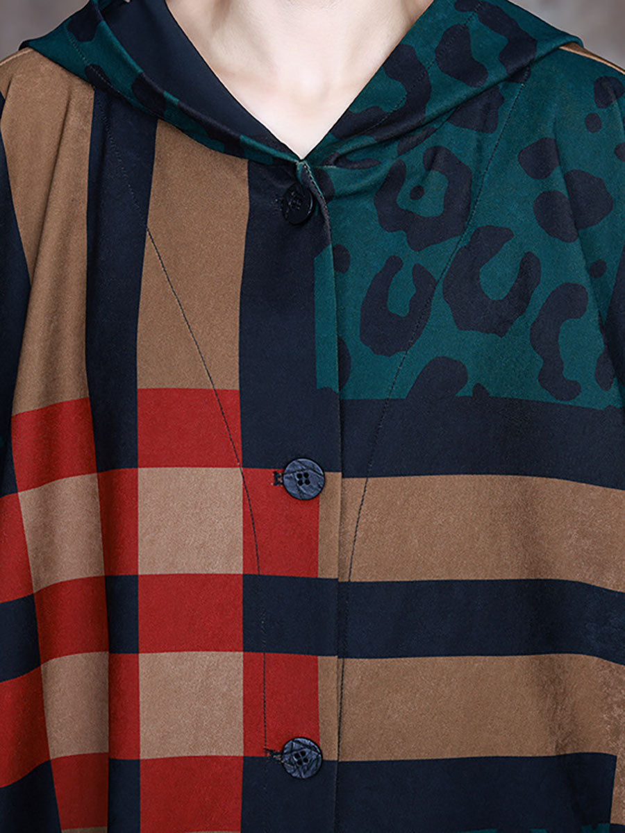 Plus-Size Women Irregular Hooded Print Plaid Coat