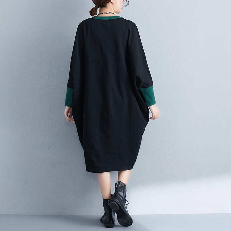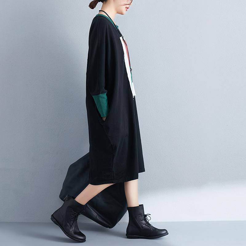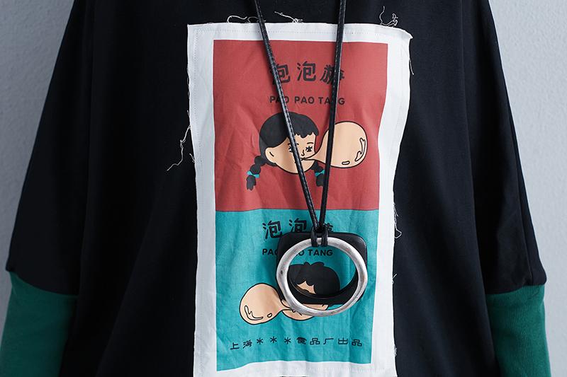 Women Long Sleeve Splicing Cartoon Applique Black Dress