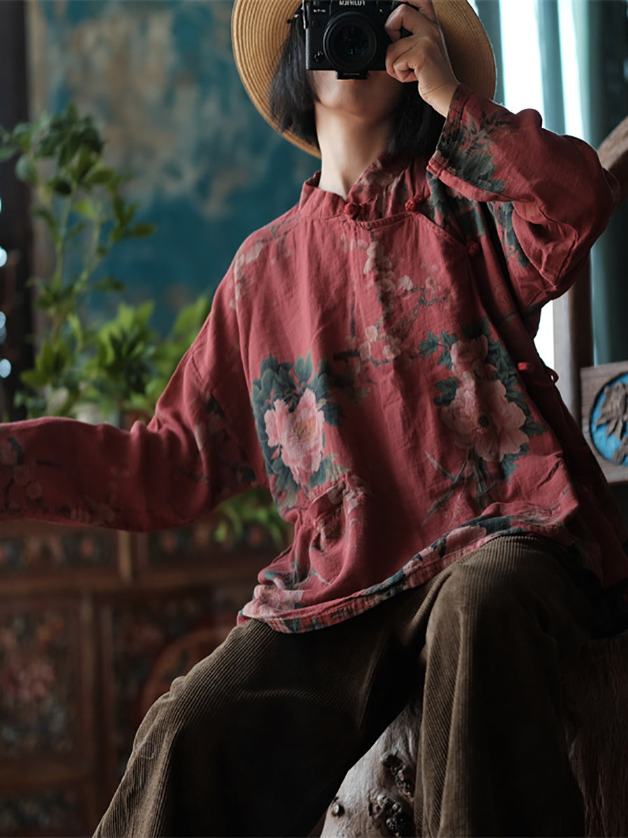Expertly crafted from soft cotton fabric. this Women's Loose Spring Shirt features a timeless retro flower pattern and a sophisticated stand collar. The full length raglan sleeves add a touch of vintage charm. making this shirt a perfect addition to your autumn and winter wardrobe.