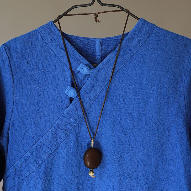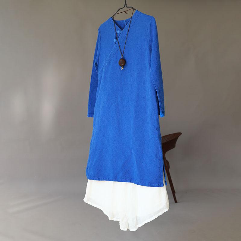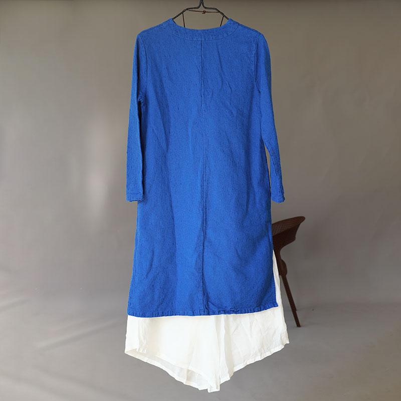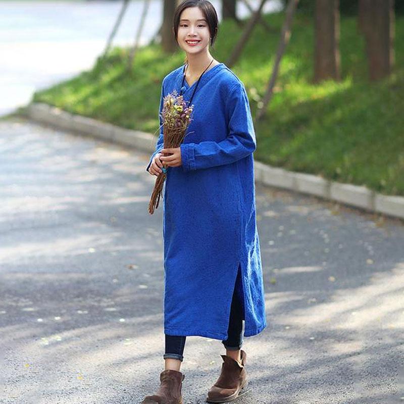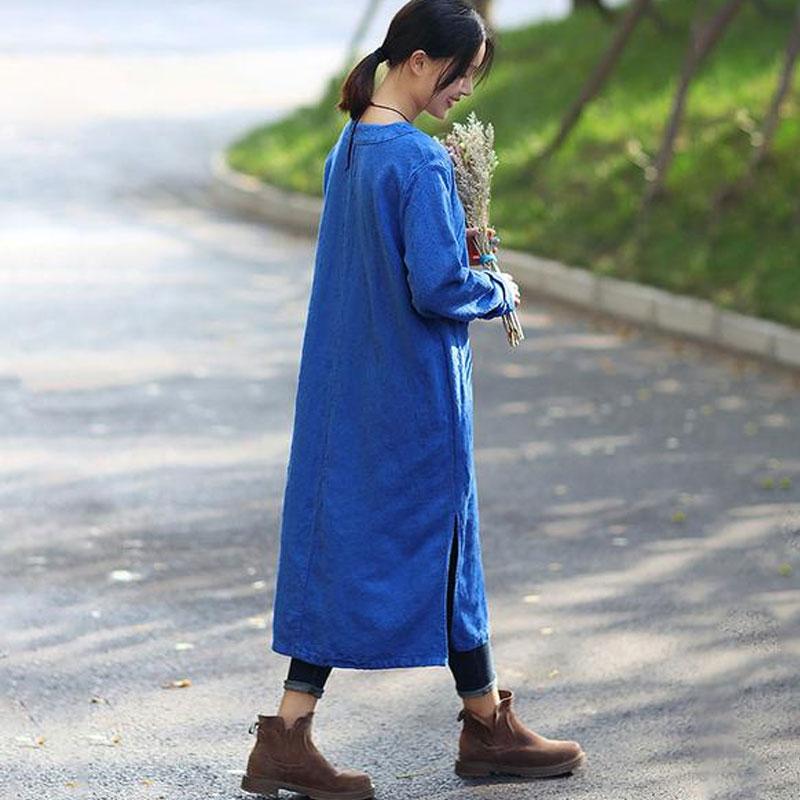 Women Retro Long Sleeve Side Slit Blue Dress