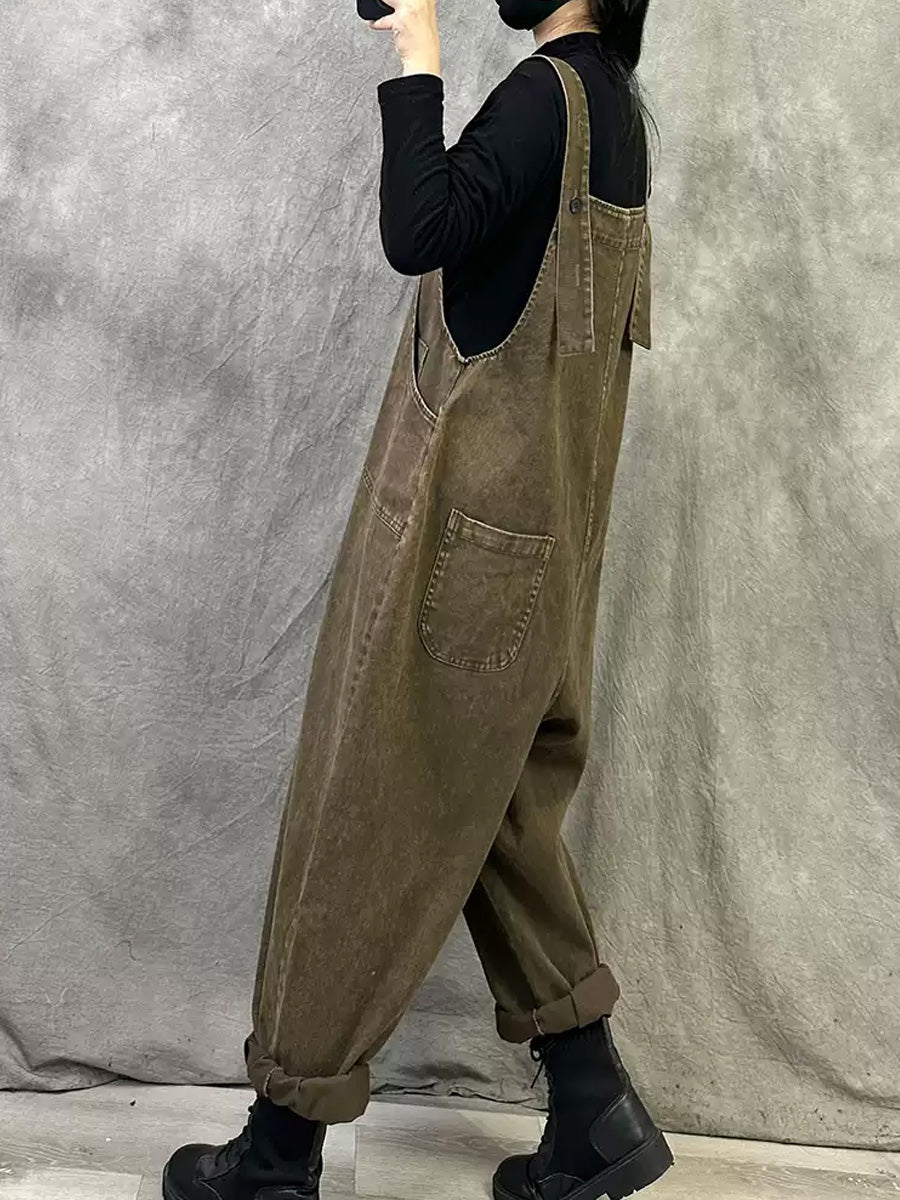Plus Size Women Spring Retro Pure Color Loose Jumpsuits