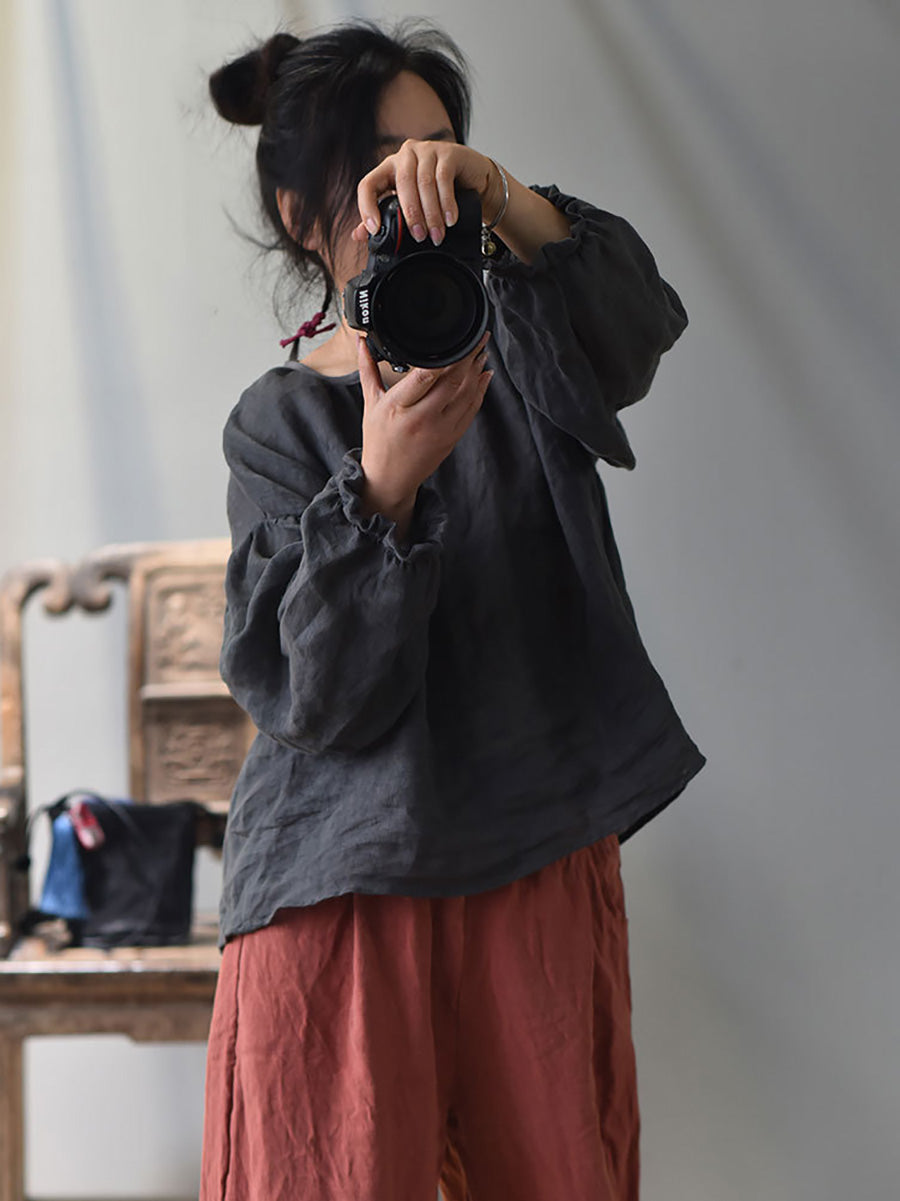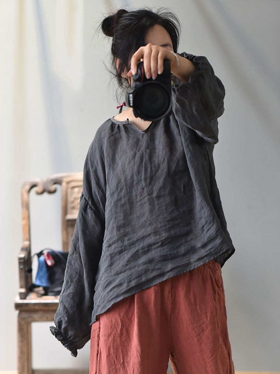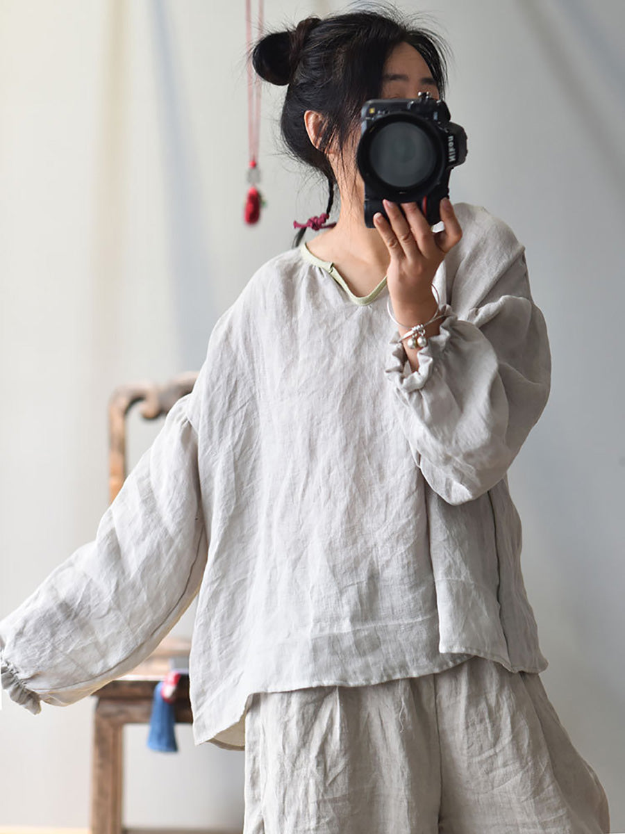 This linen shirt features a solid pattern. V-neck collar. puff sleeves. raglan sleeves. and a vintage style. It is perfect for the spring season and exudes a classic. retro vibe.