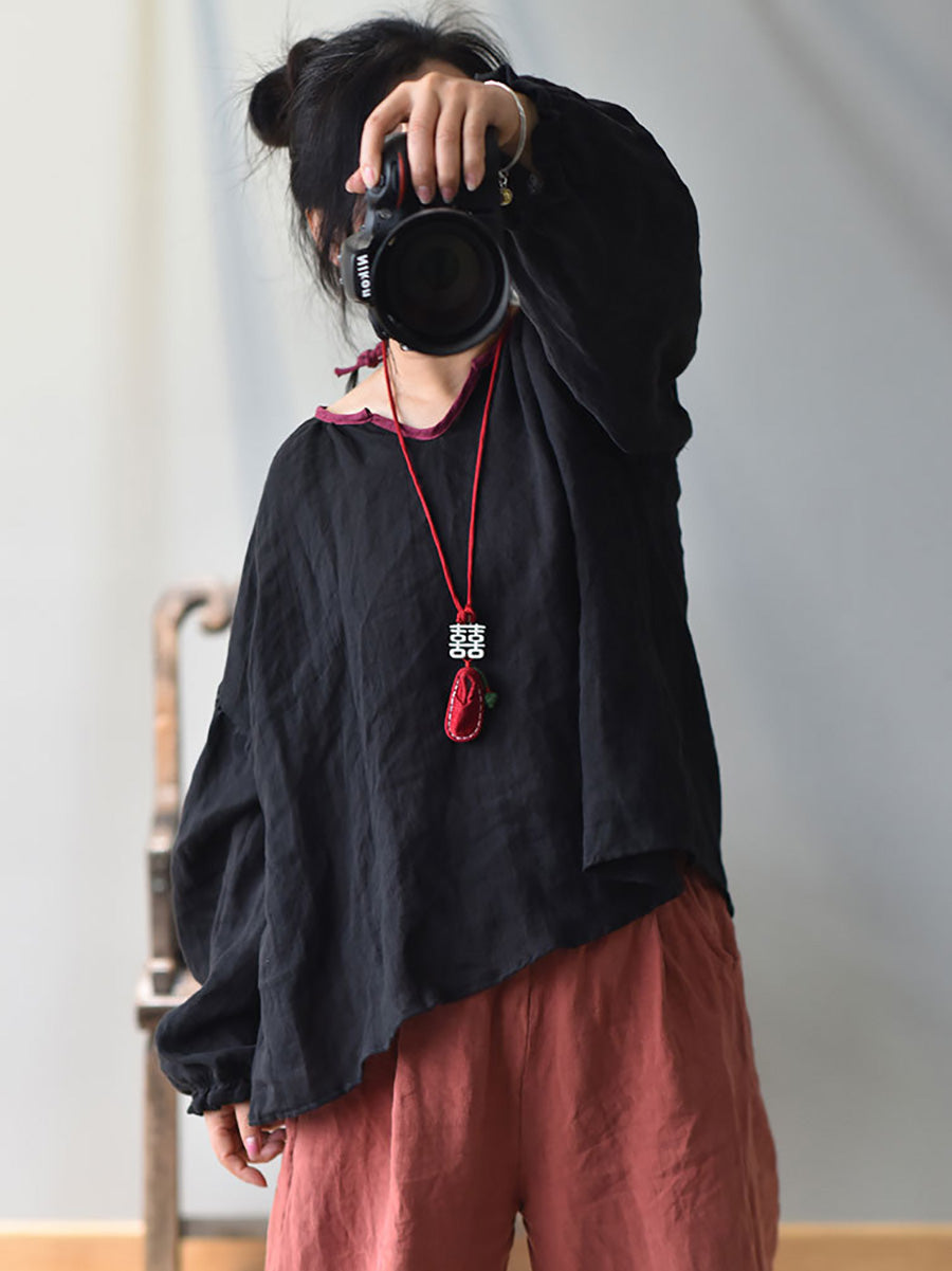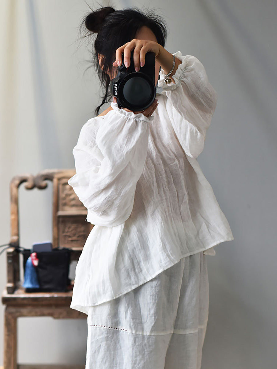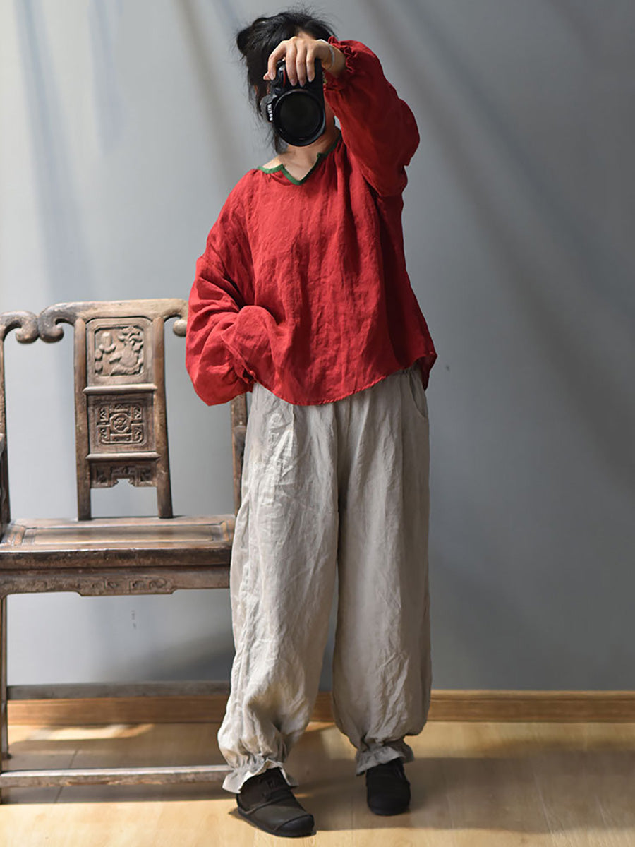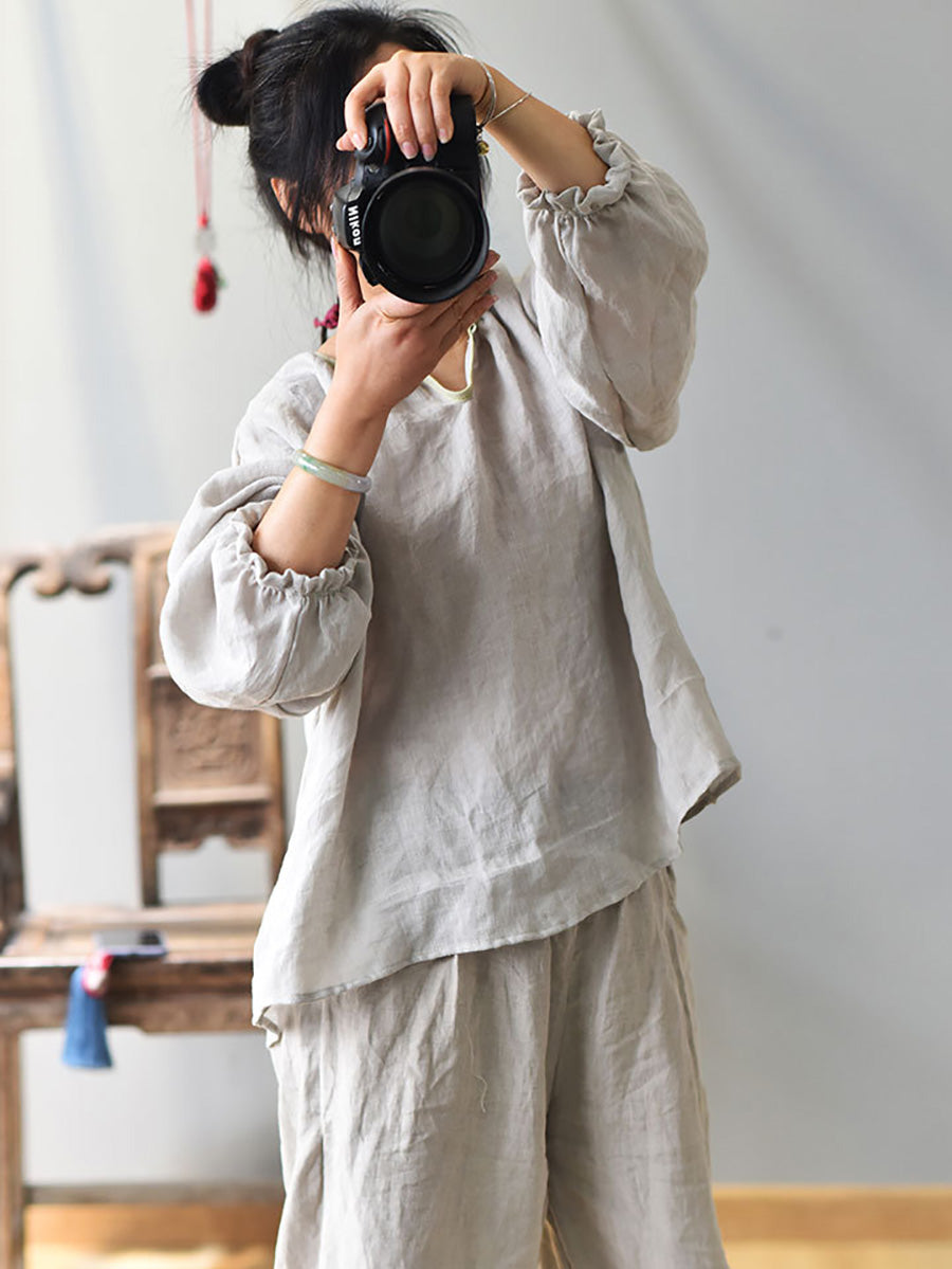 This linen shirt features a solid pattern. V-neck collar. puff sleeves. raglan sleeves. and a vintage style. It is perfect for the spring season and exudes a classic. retro vibe.