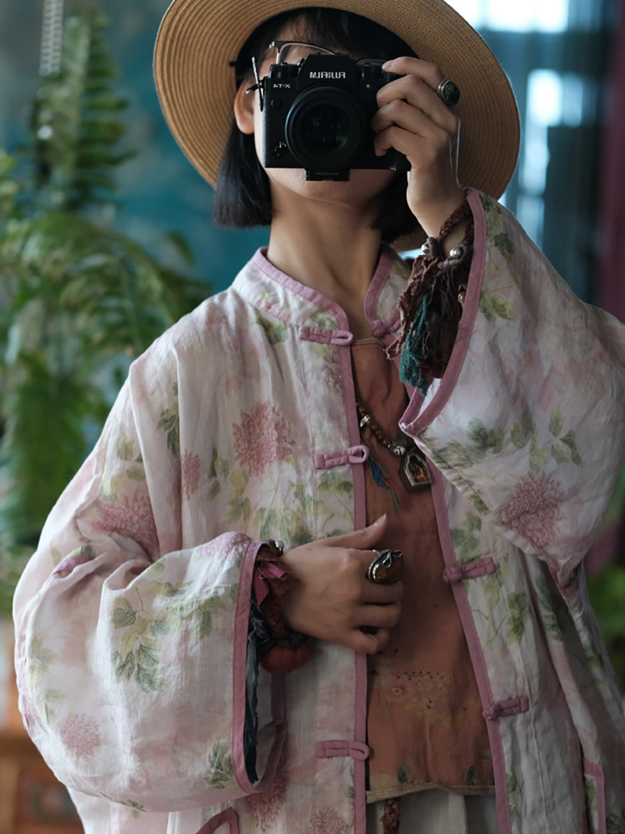 Women Spring Vintage Ramie Floral Button-Up Shirt