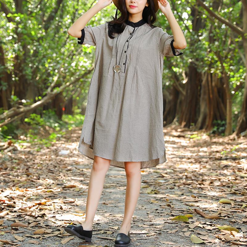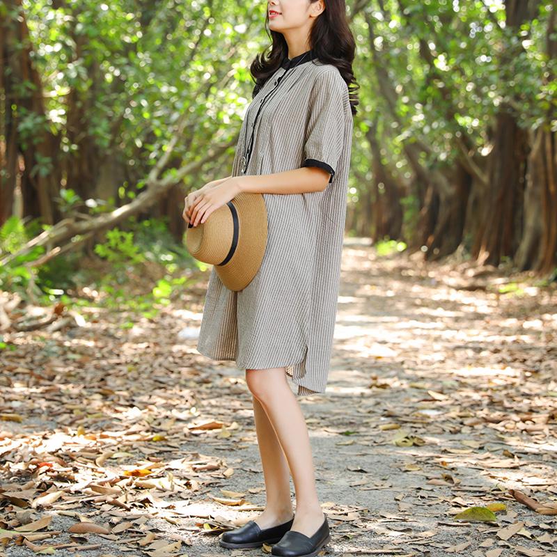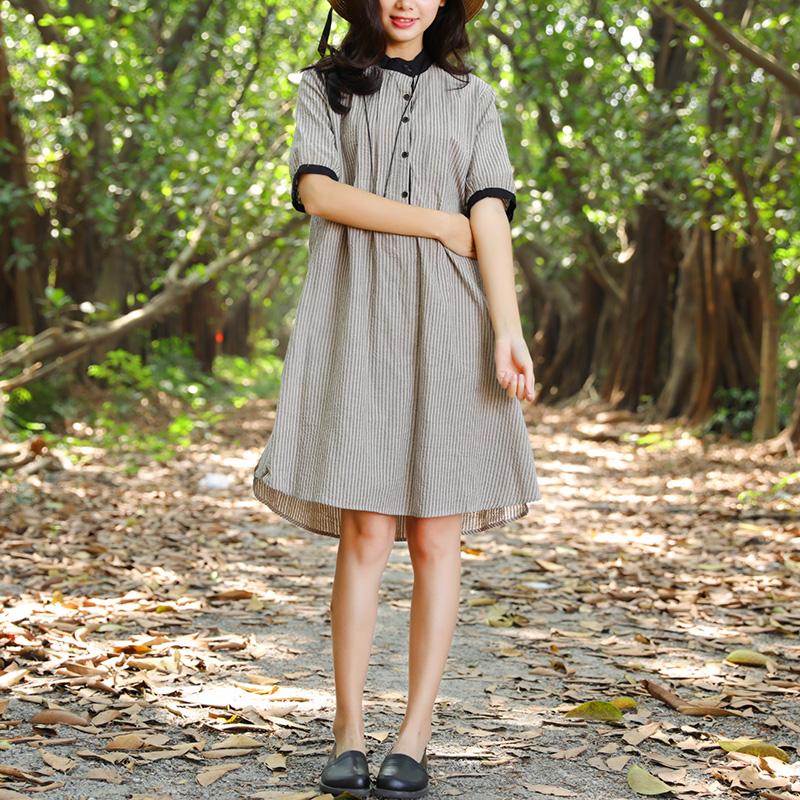 Women Stand Collar Buttons Stripe Pockets 1/2 Sleeve Dress