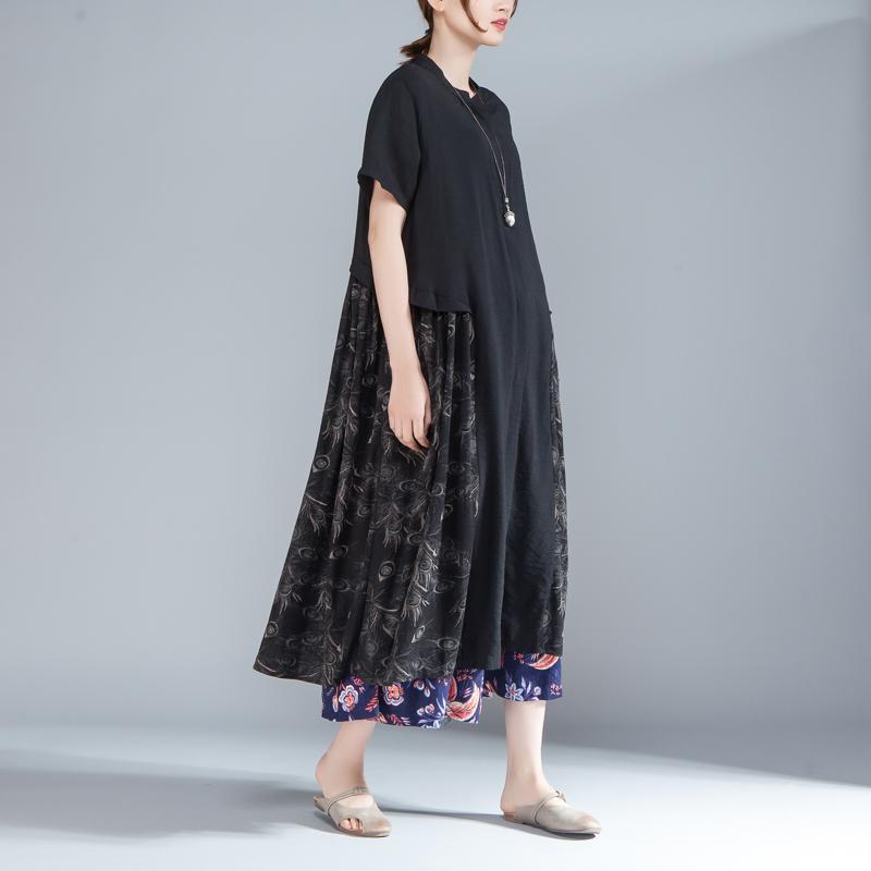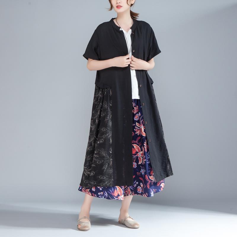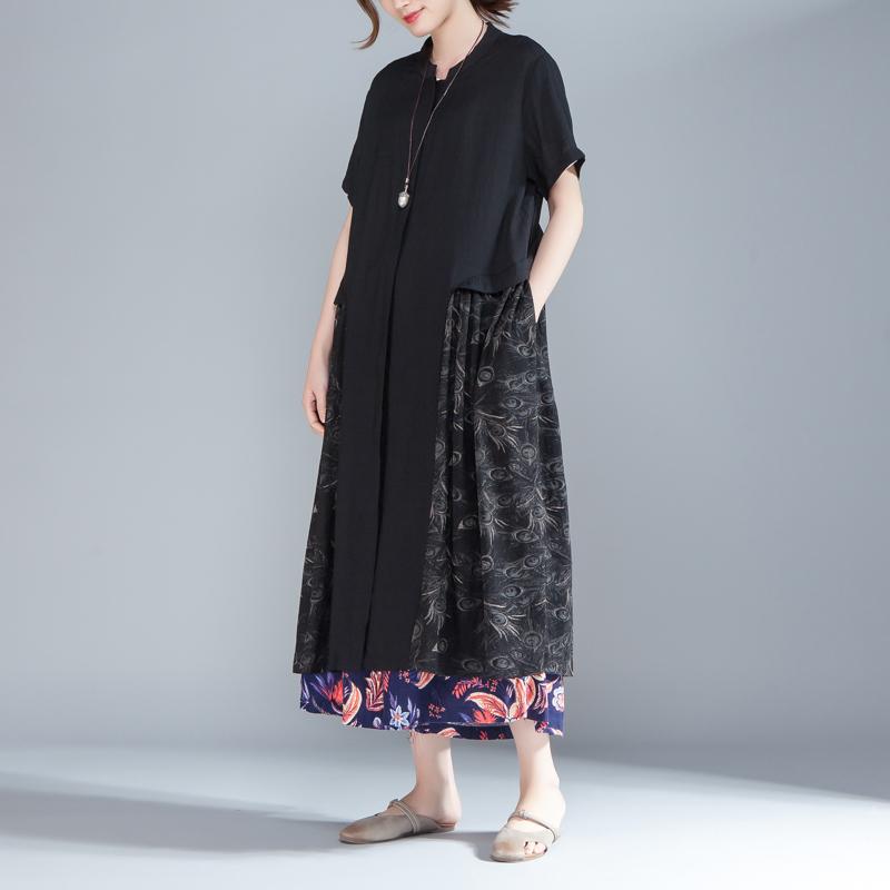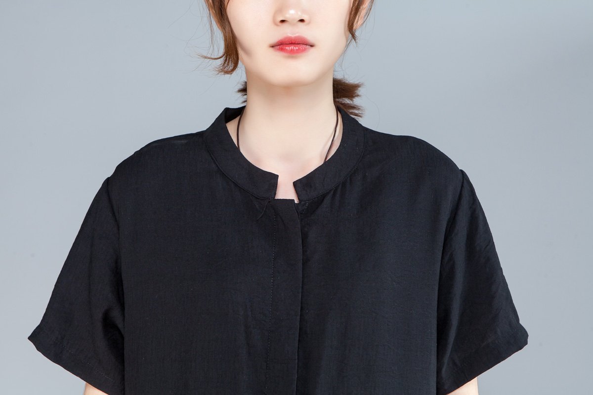 Women Stand Collar Single Breasted Short Sleeve Black Dress