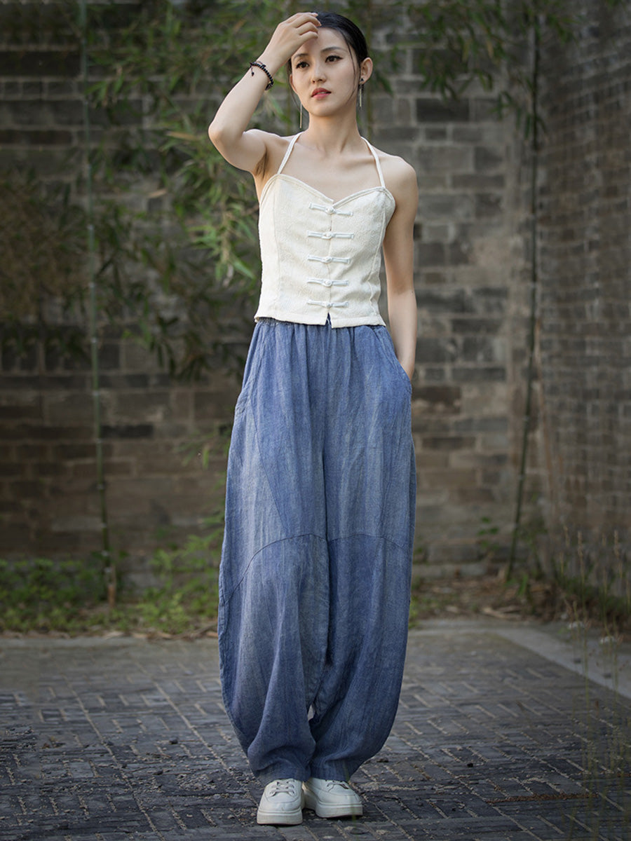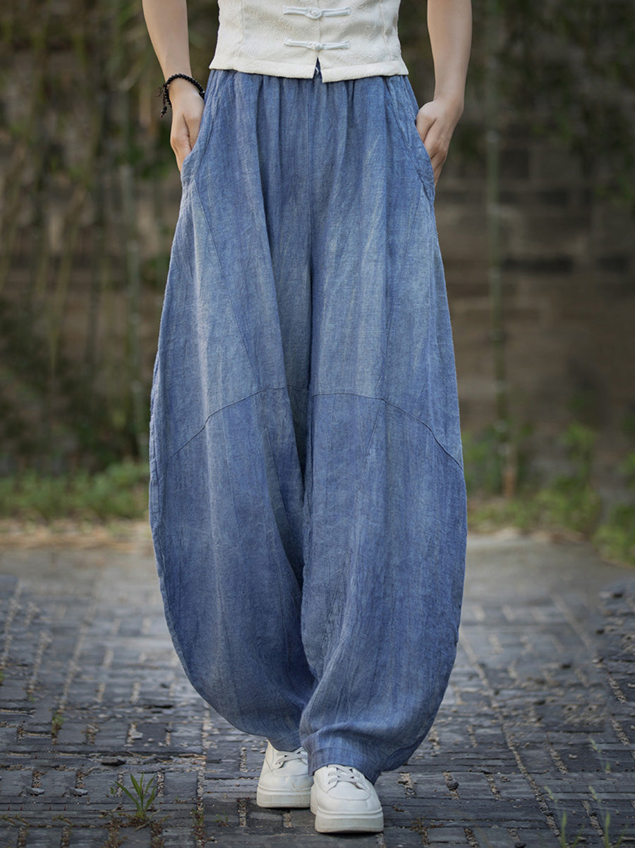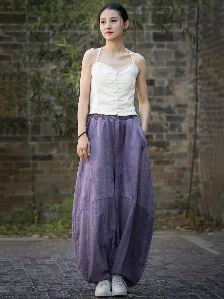 This product is made of 80%Ramie20%Cotton. featuring a retro and artsy style. The elastic waist and tie-dye pattern on these bloomers make for a comfortable fit and unique look. With an ankle-length design. these pants are perfect for the spring and summer season.