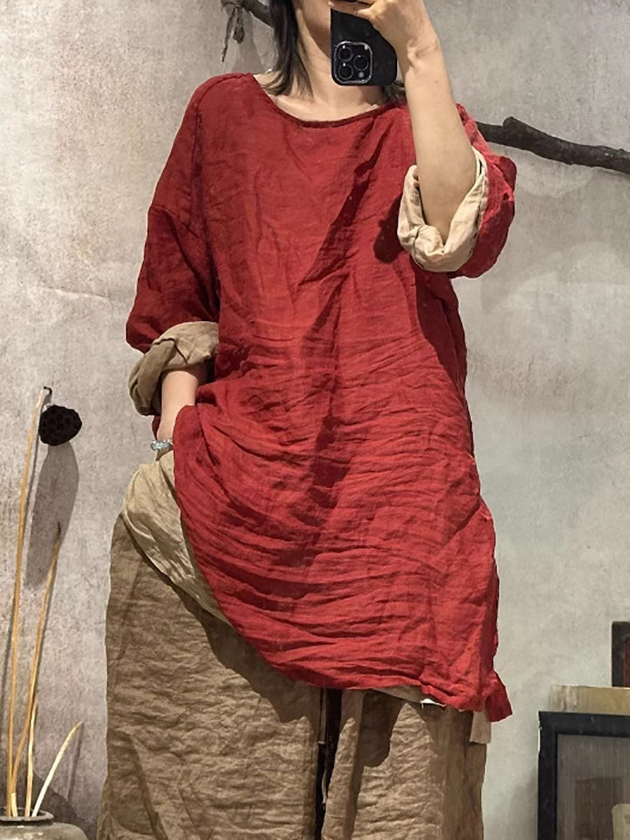 Women Summer Artsy Pure Color O-Neck Ramie Shirt