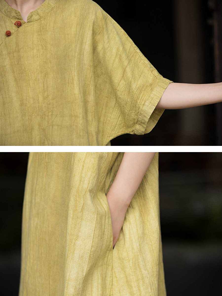 Women Summer Artsy Tie-dye Stand Collar Ramie Dress