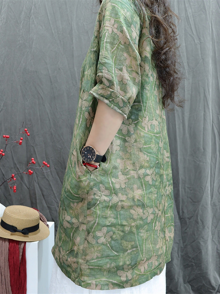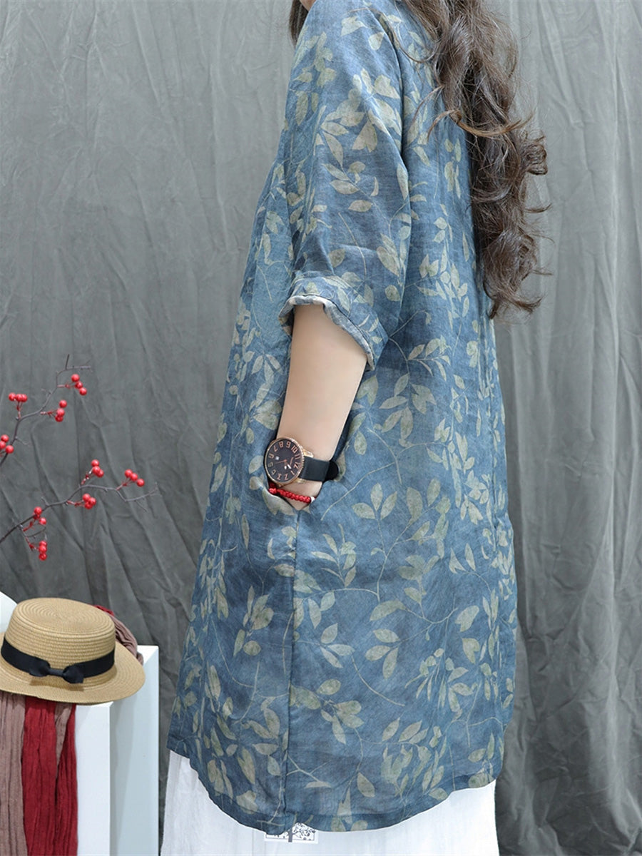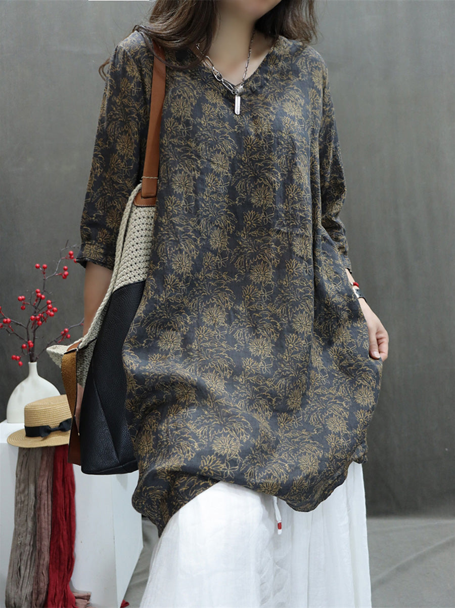 Plus Size Women Summer Artsy V-Neck Flower 100%Ramie Shirt