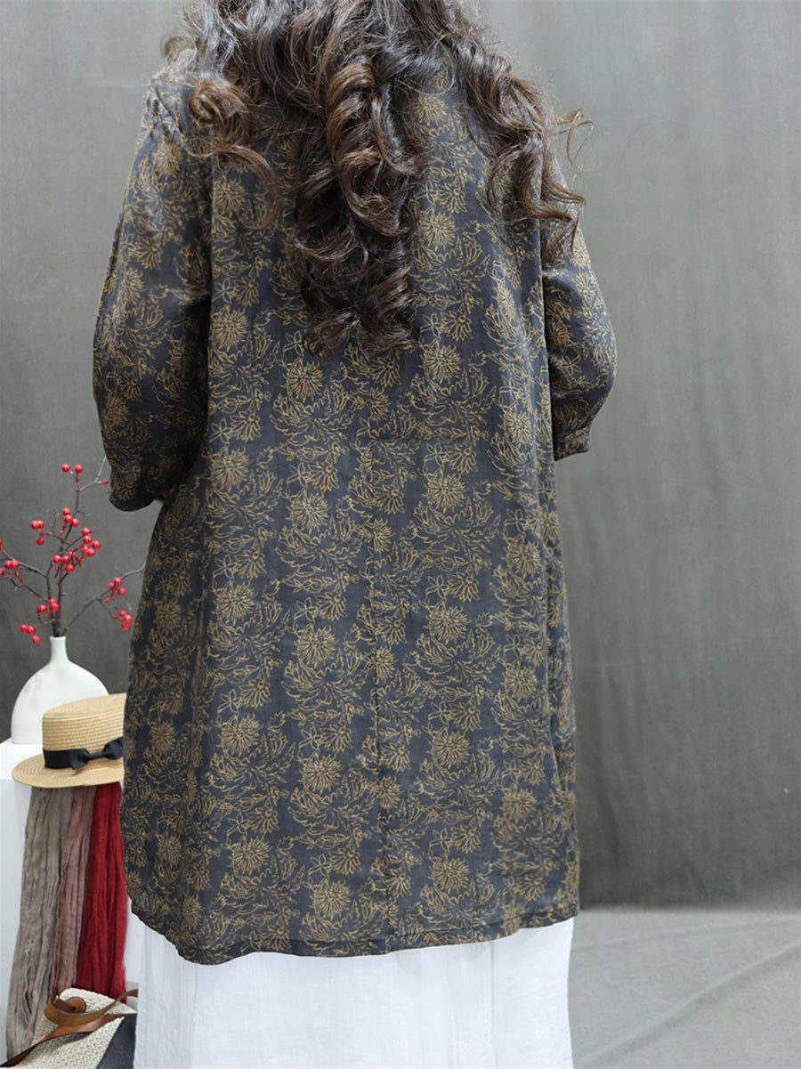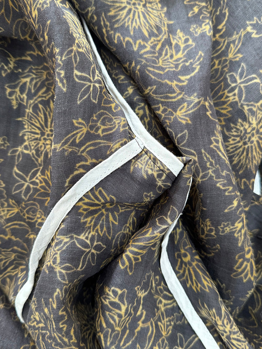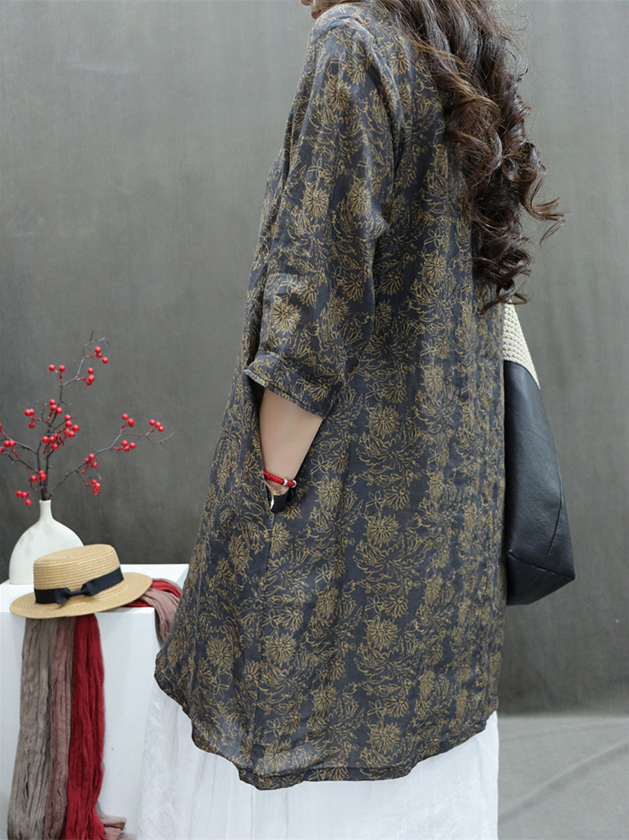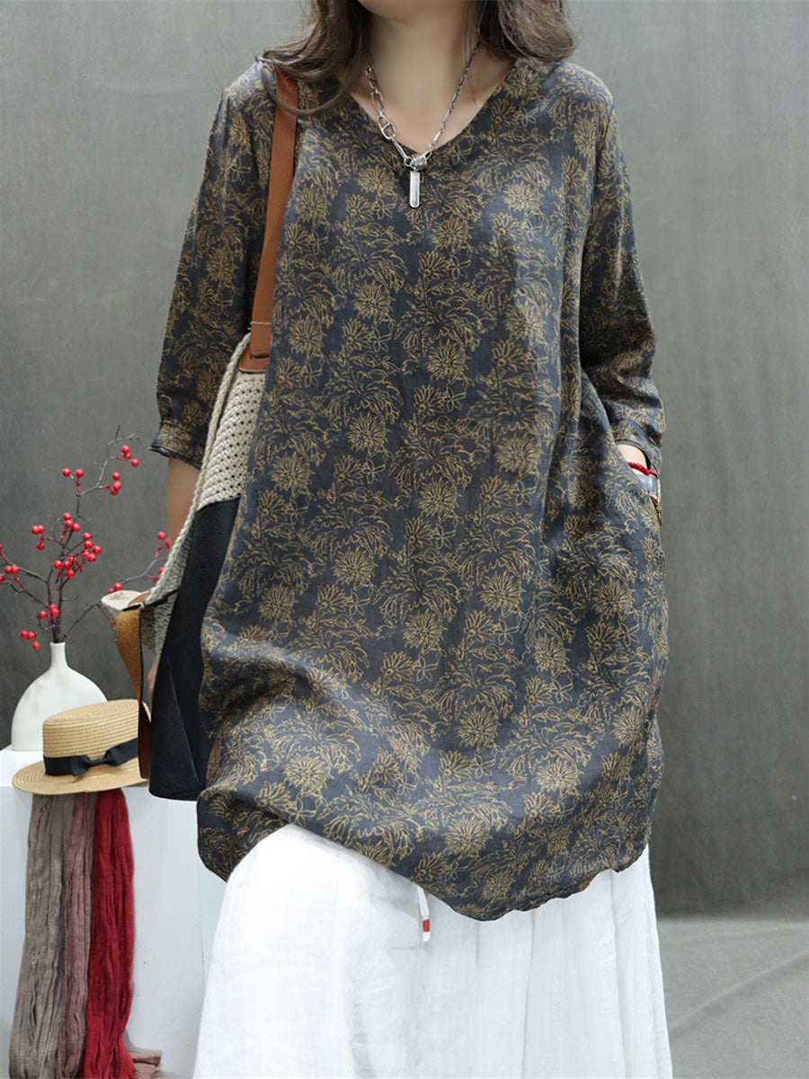 Plus Size Women Summer Artsy V-Neck Flower 100%Ramie Shirt