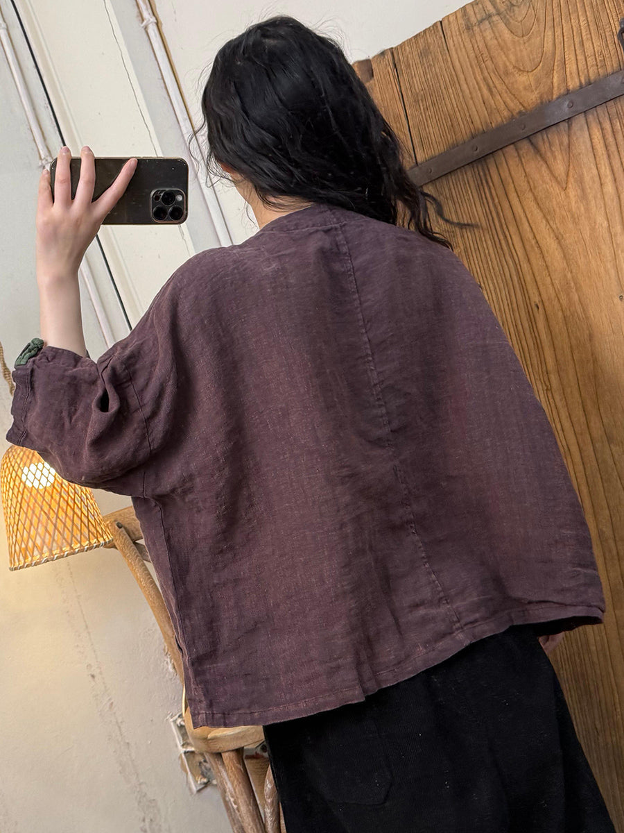 Women Summer Retro Colorful Button O-Neck 100%Linen Shirt