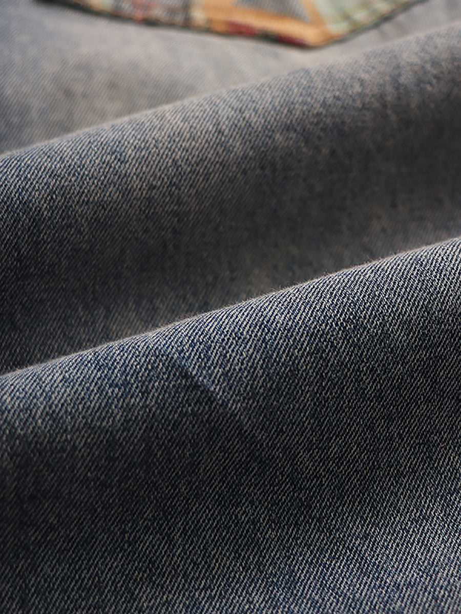 Women Summer Retro Embroidery Spliced Burrs Denim Pants