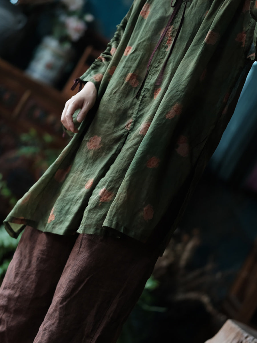 Women Summer Retro Flower O-Neck Ramie Loose Shirt