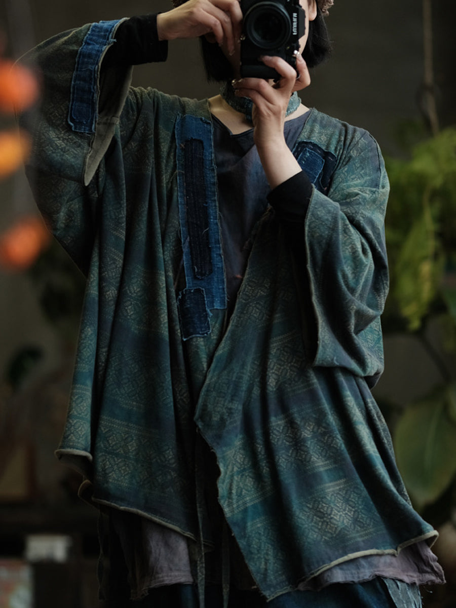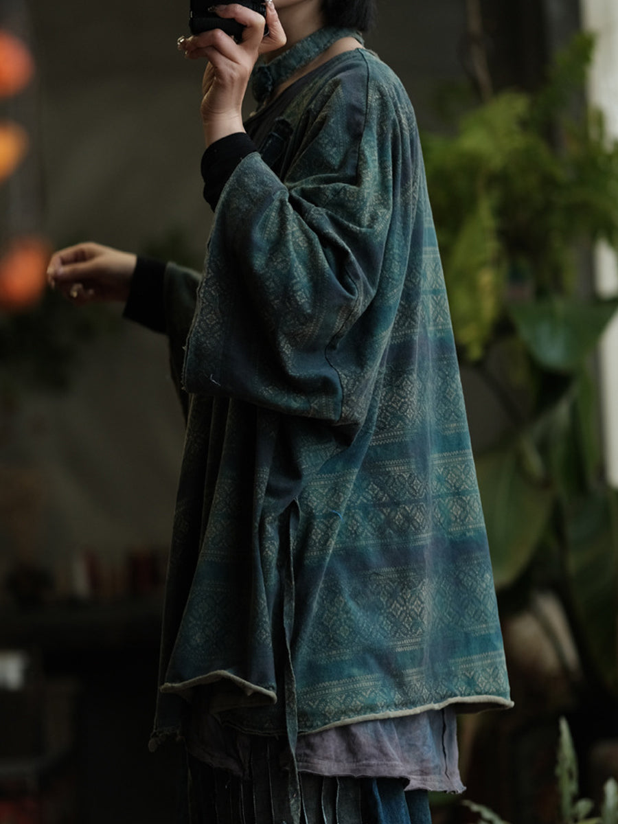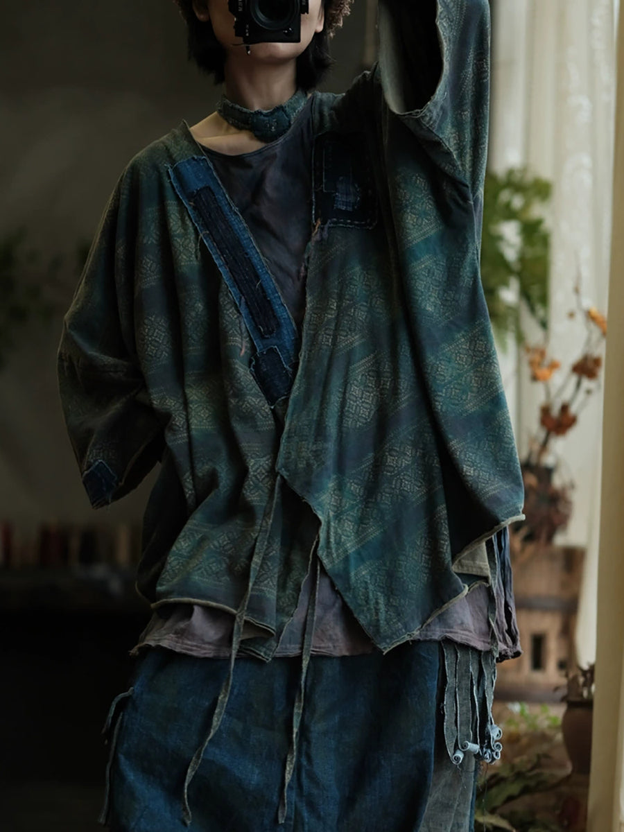 Women Autumn Retro Print Spliced V-Neck Cotton Shirt