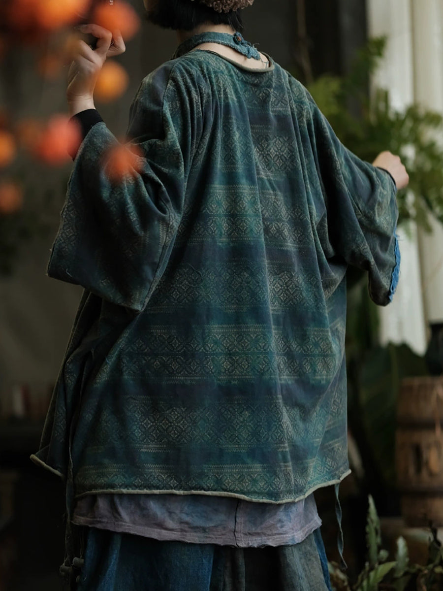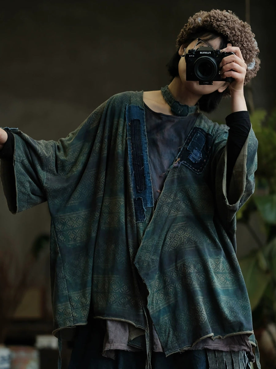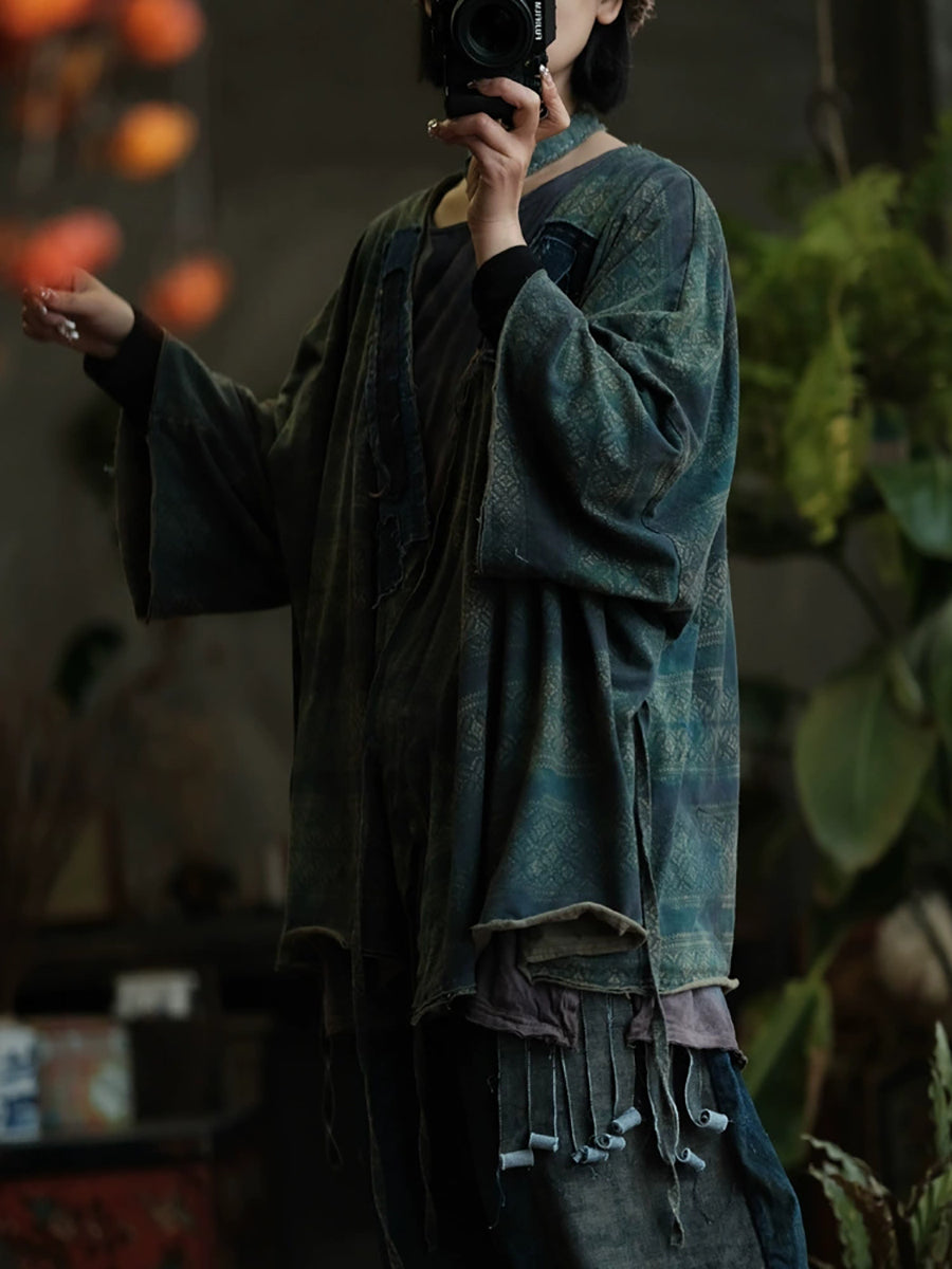 Women Autumn Retro Print Spliced V-Neck Cotton Shirt
