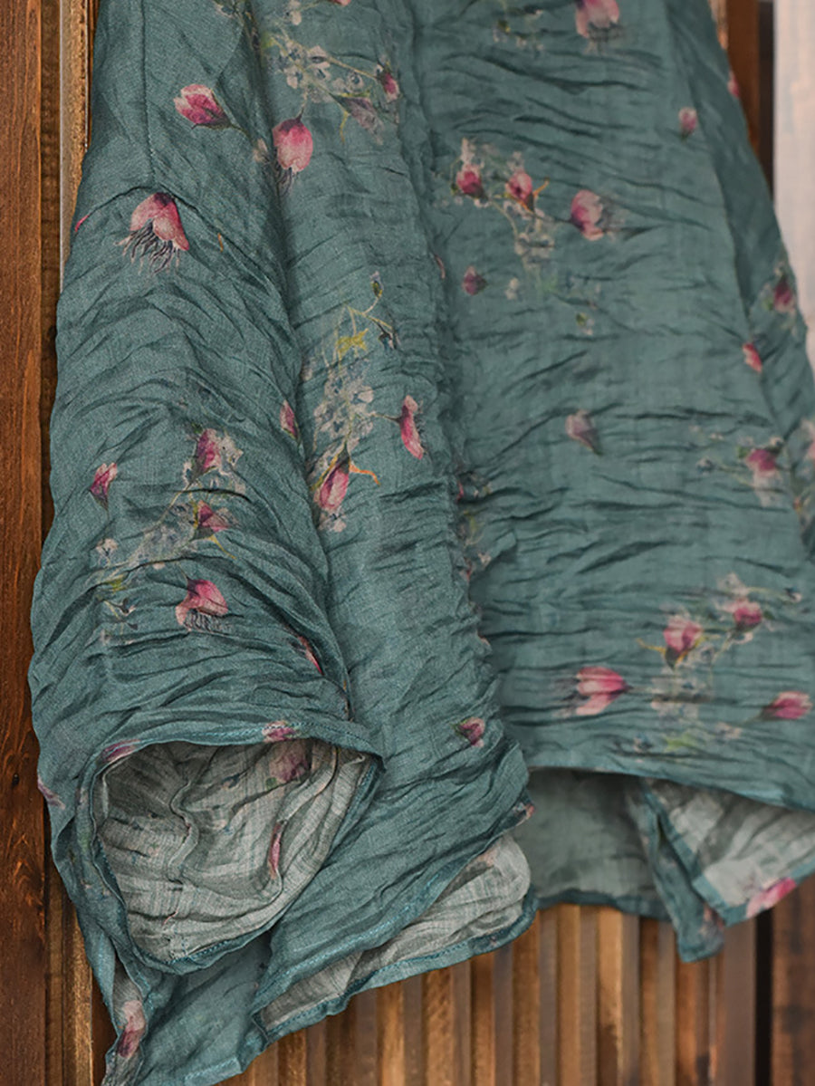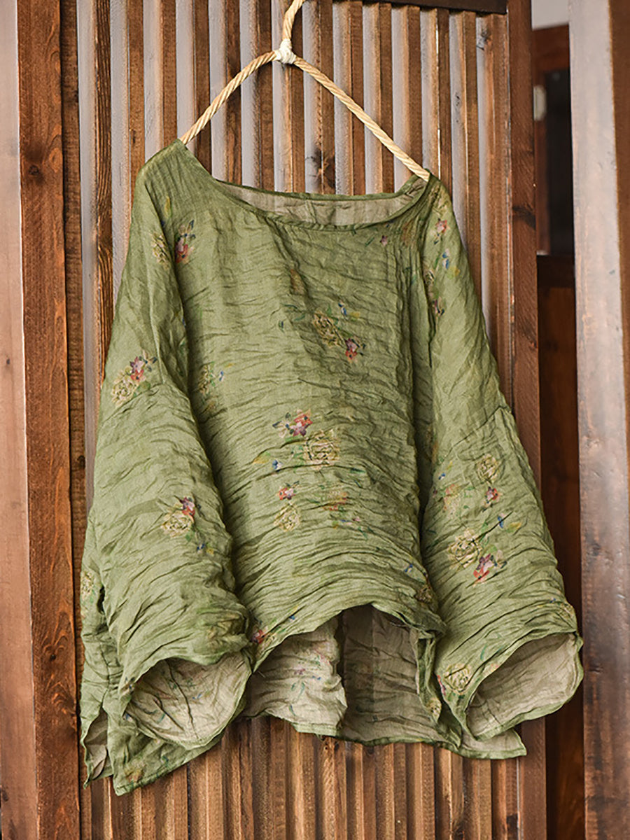 As an expert in the fashion industry. I would like to highlight the use of high-quality ramie material and a beautiful flower pattern in this shirt. The O-neck collar and full-length raglan sleeves make it both comfortable and stylish. perfect for the spring and summer seasons. Don't miss out on this artsy addition to your wardrobe!
