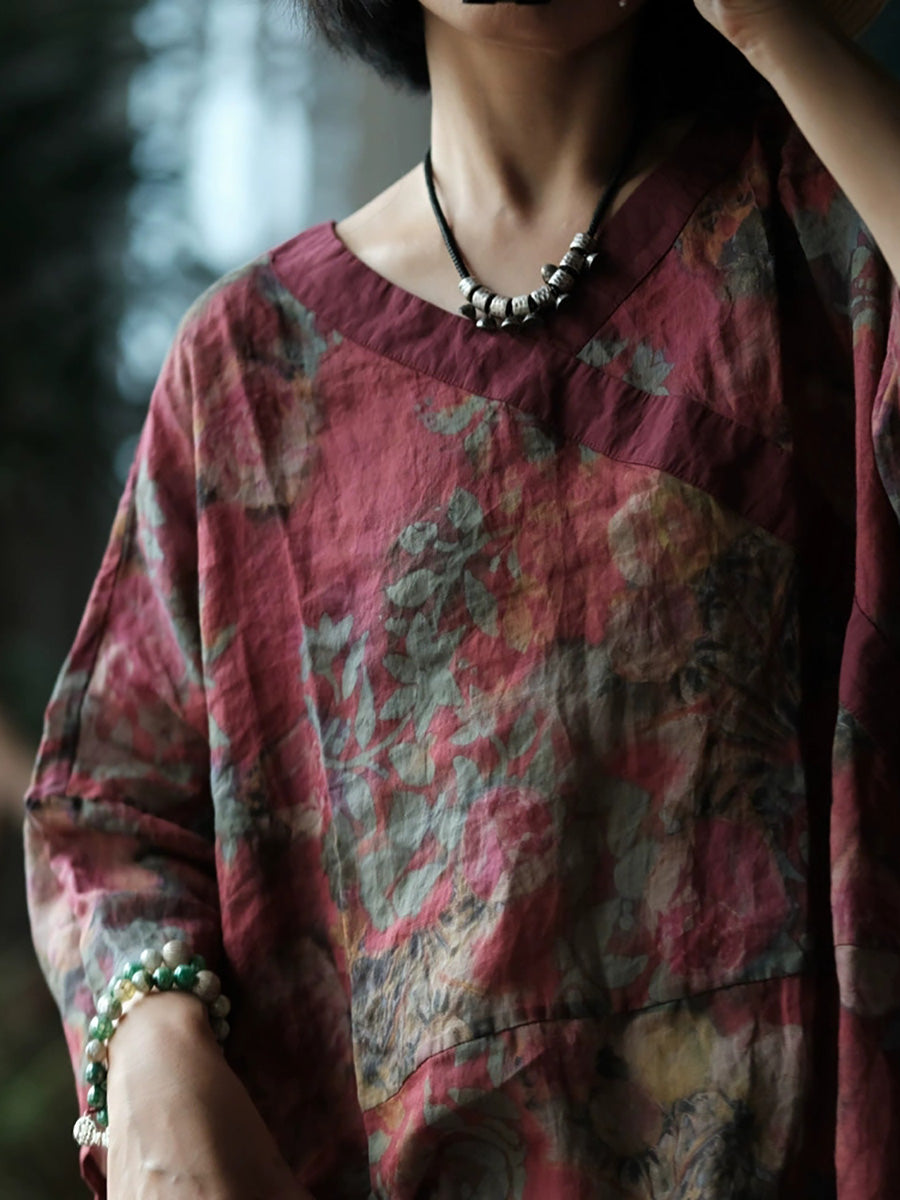 Women Summer Vintage Flower Ramie V-Neck Dress