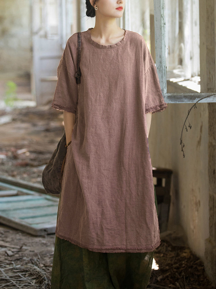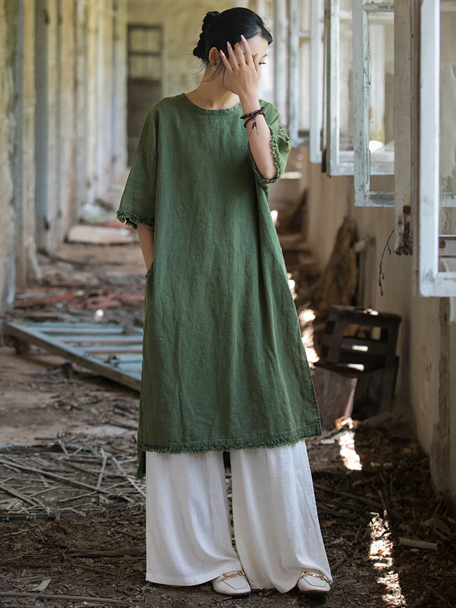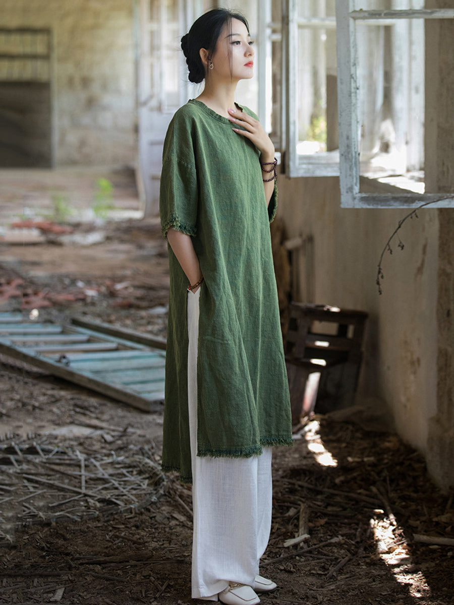 This dress is designed to keep you cool during summer while maintaining a fashionable look. with its knee-length design. solid pattern. O-Neck collar. and split hem detail.