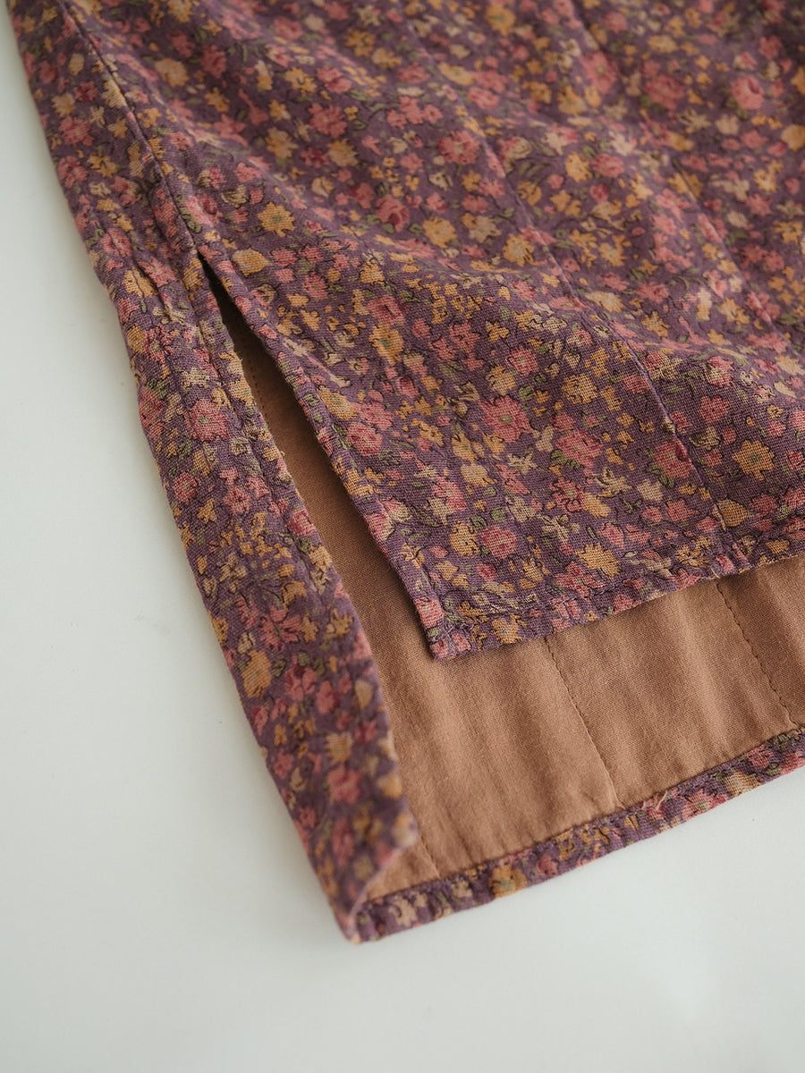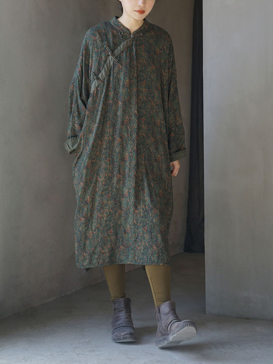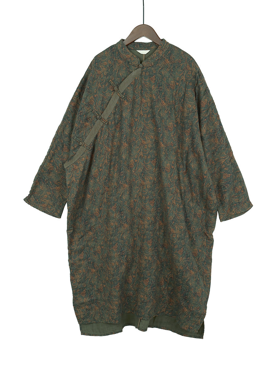 This long robe dress is made of 100% cotton and features a stand collar. raglan sleeves. and a knee-length cut. The fabric has a beautiful floral pattern and the hem is split for added style. Perfect for the spring and autumn seasons.