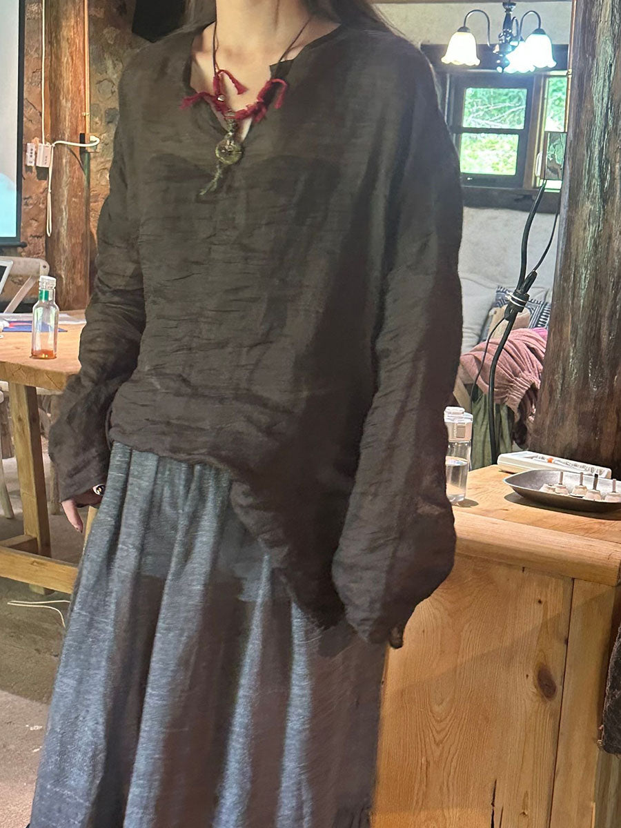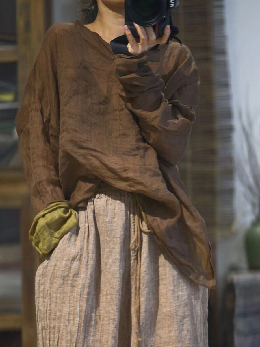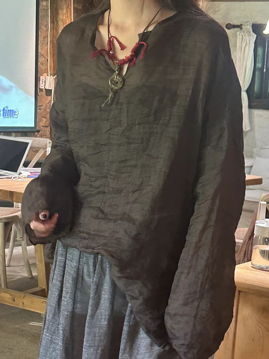 Women Vintage V-Neck Ramie Solid Loose Blouse