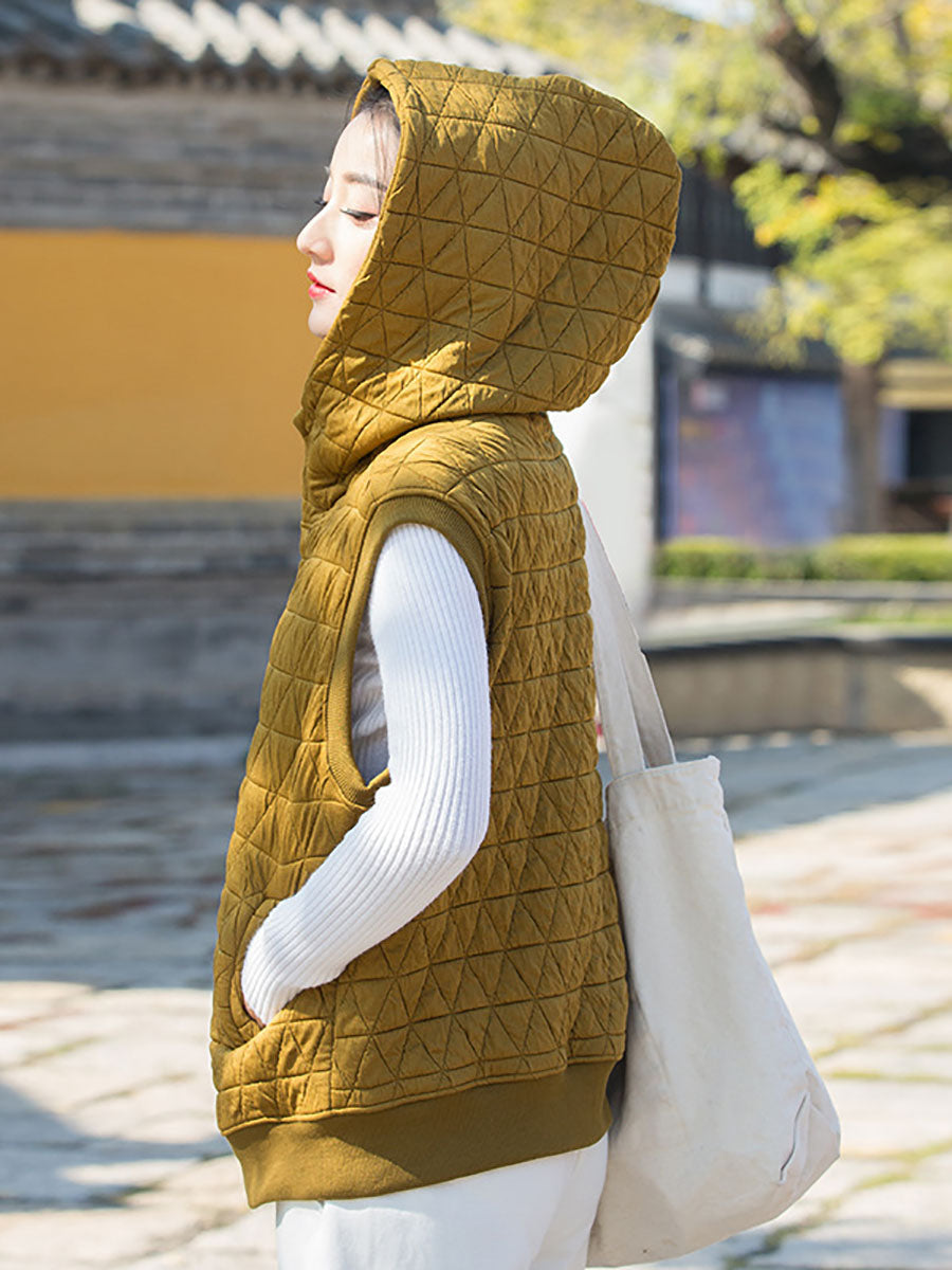 Women Winter Artsy Solid Button Pocket Hooded Vest