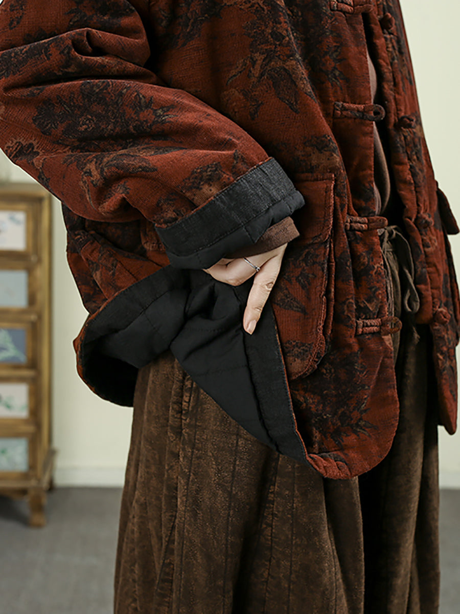 Crafted from linen. this padded coat features a floral pattern and a stand collar design. It offers full-length sleeves with a classic retro style. making it ideal for the autumn and winter seasons.
