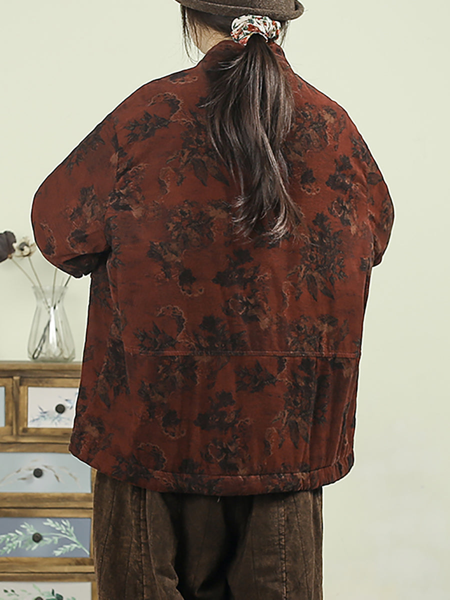 Women Winter Ethnic Flower Stand Collar Padded Coat