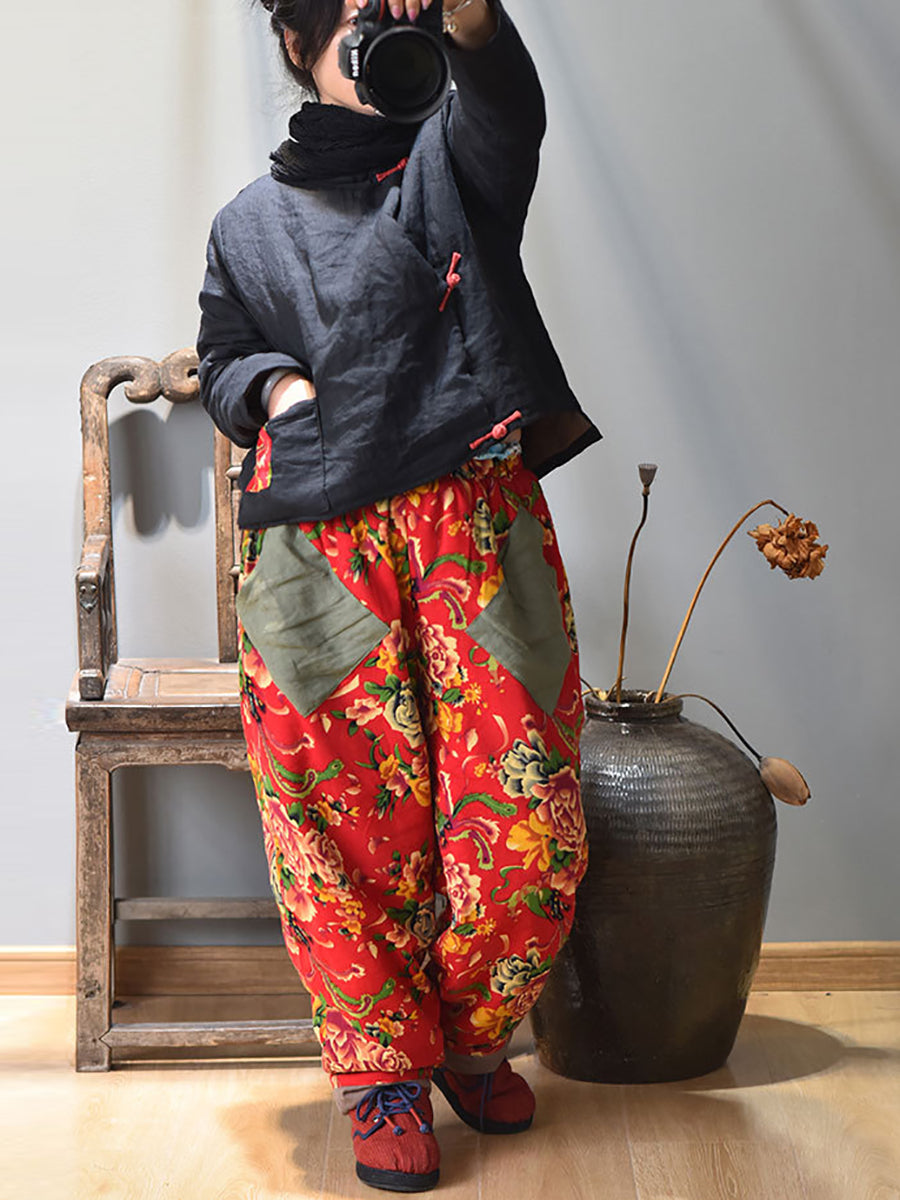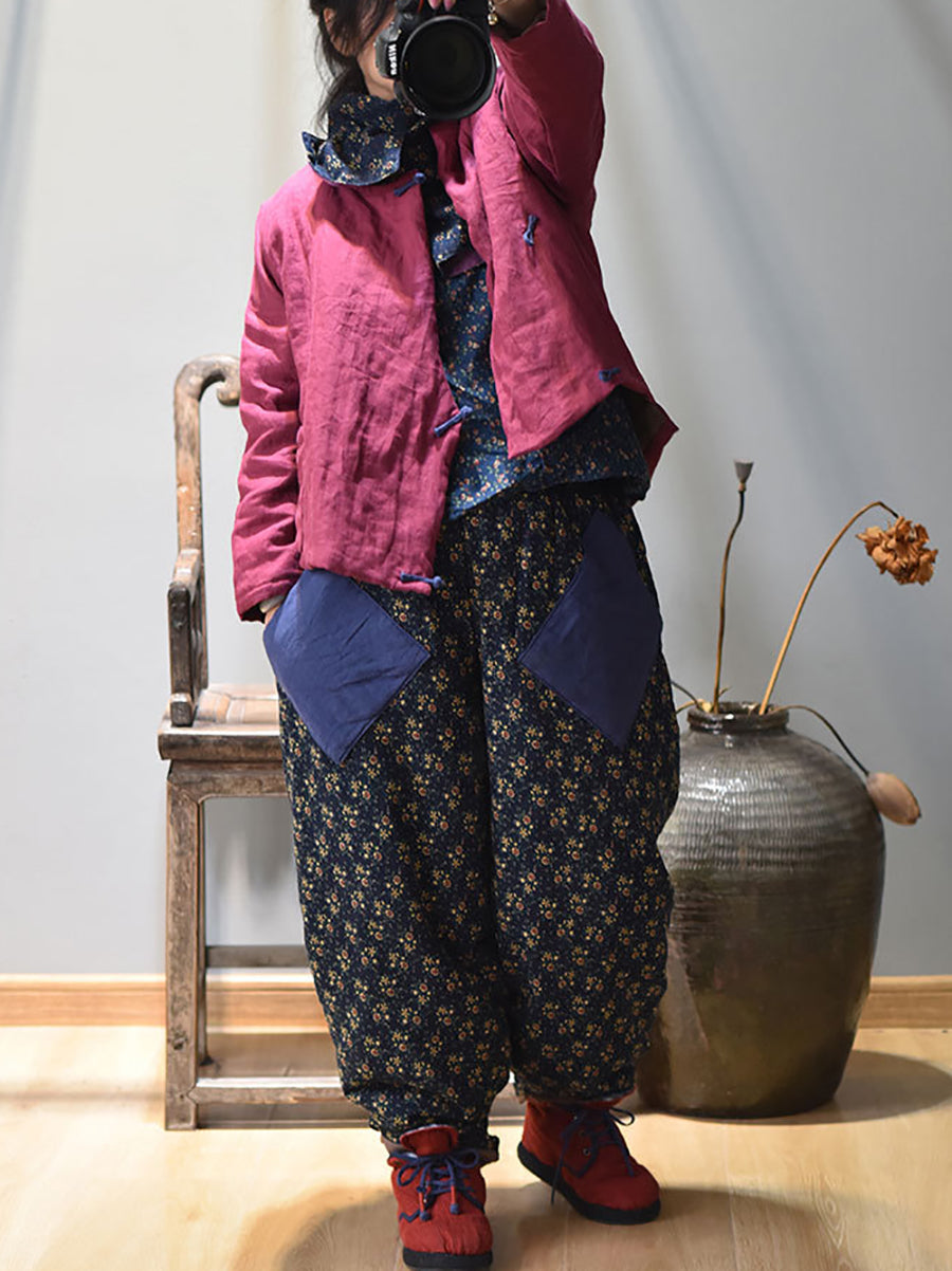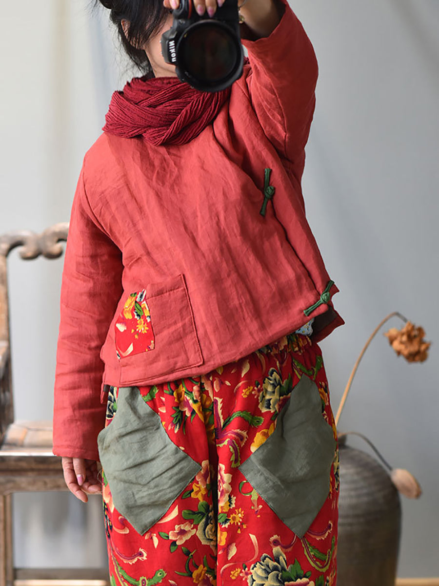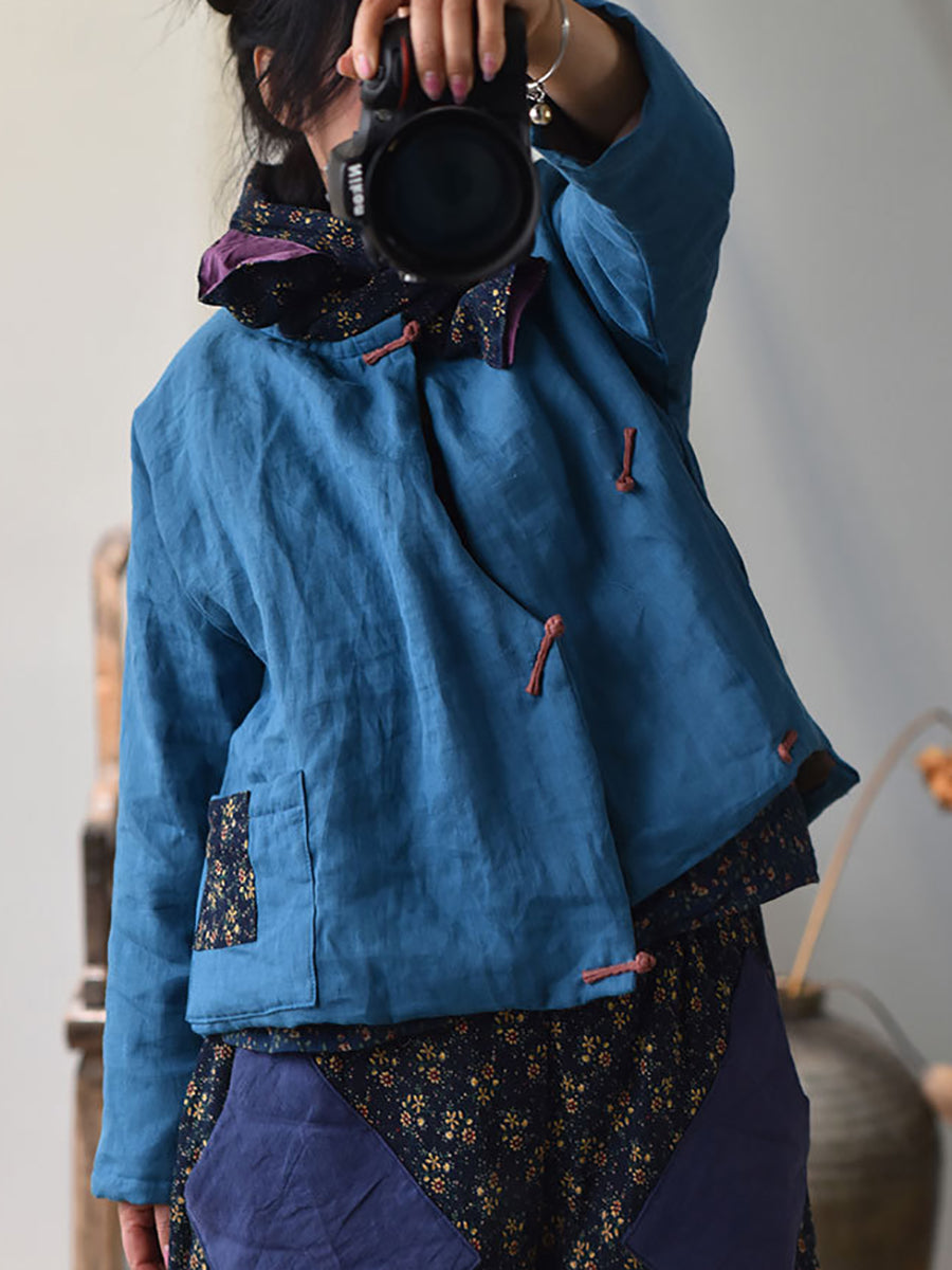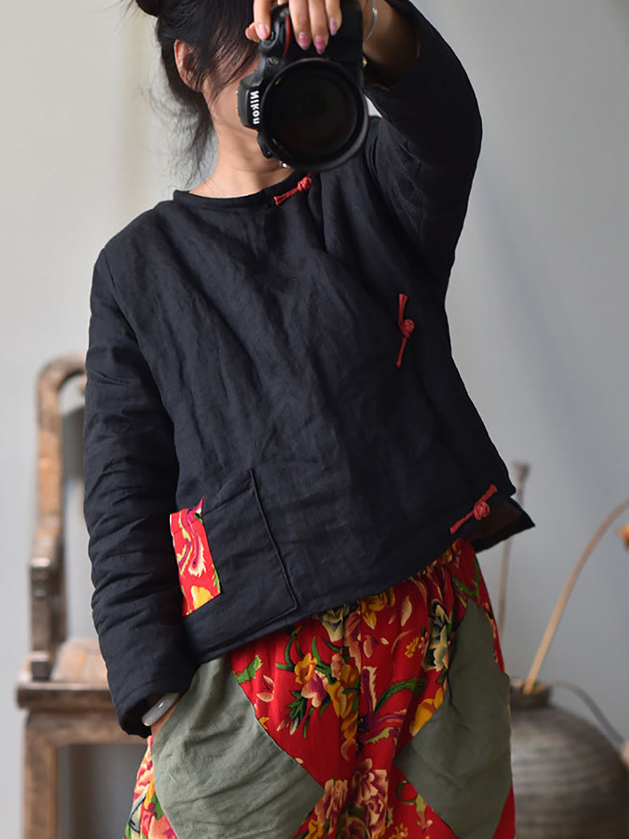 Women Winter Retro Patch O-Neck Ramie Padded Coat
