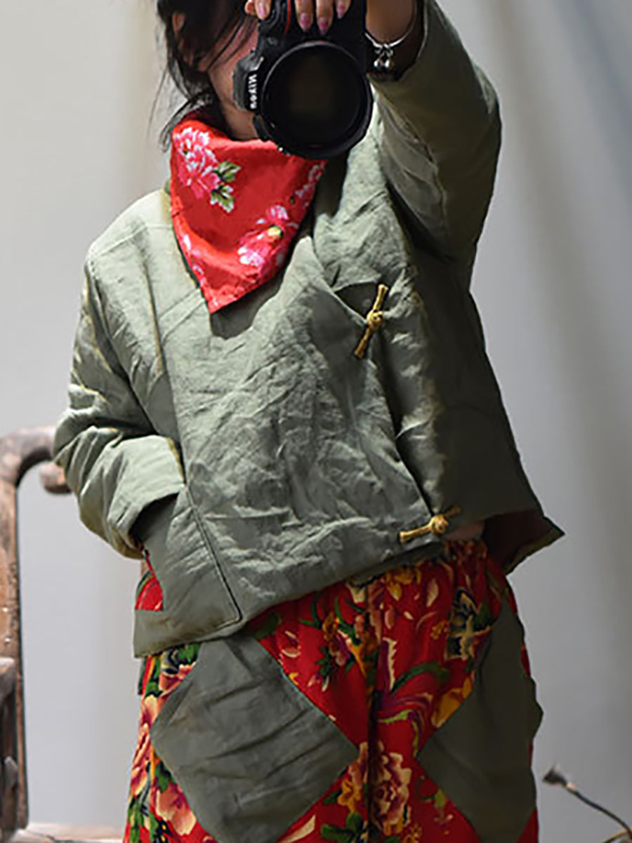 This coat is made with high-quality ramie material and features a unique patch pattern. It also includes a button collar and full length. regular sleeves with a vintage style. Perfect for the autumn and winter season. this coat adds a touch of retro elegance to any wardrobe.
