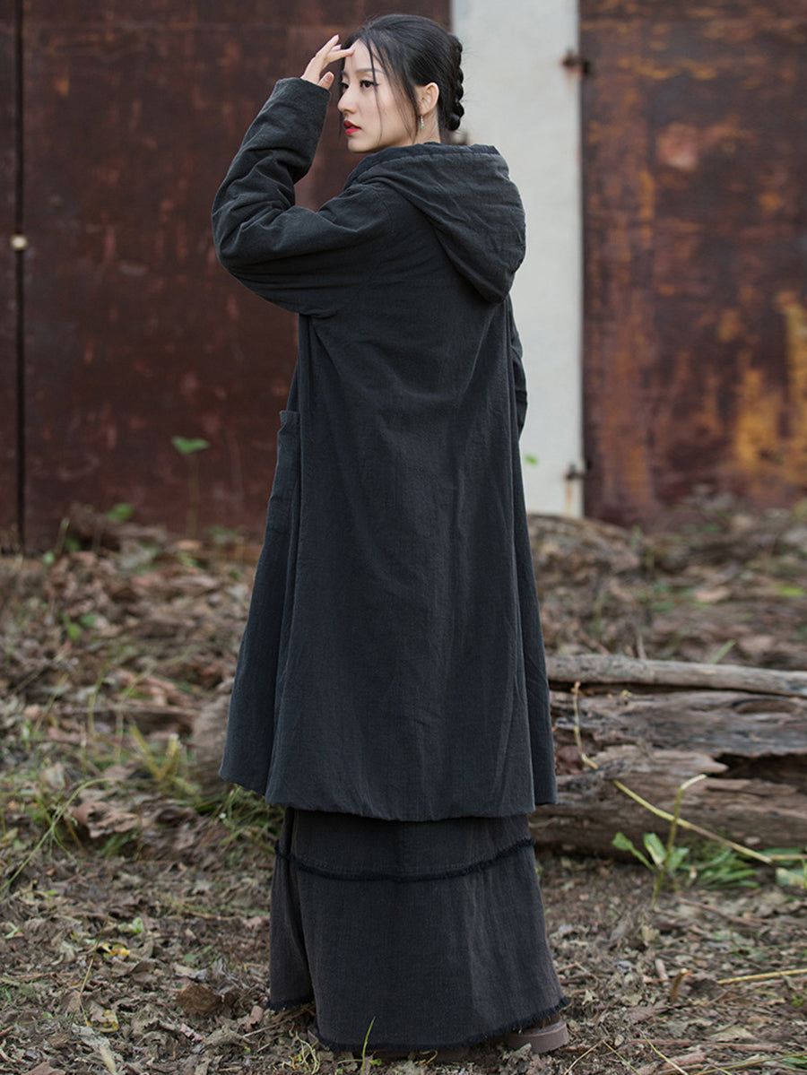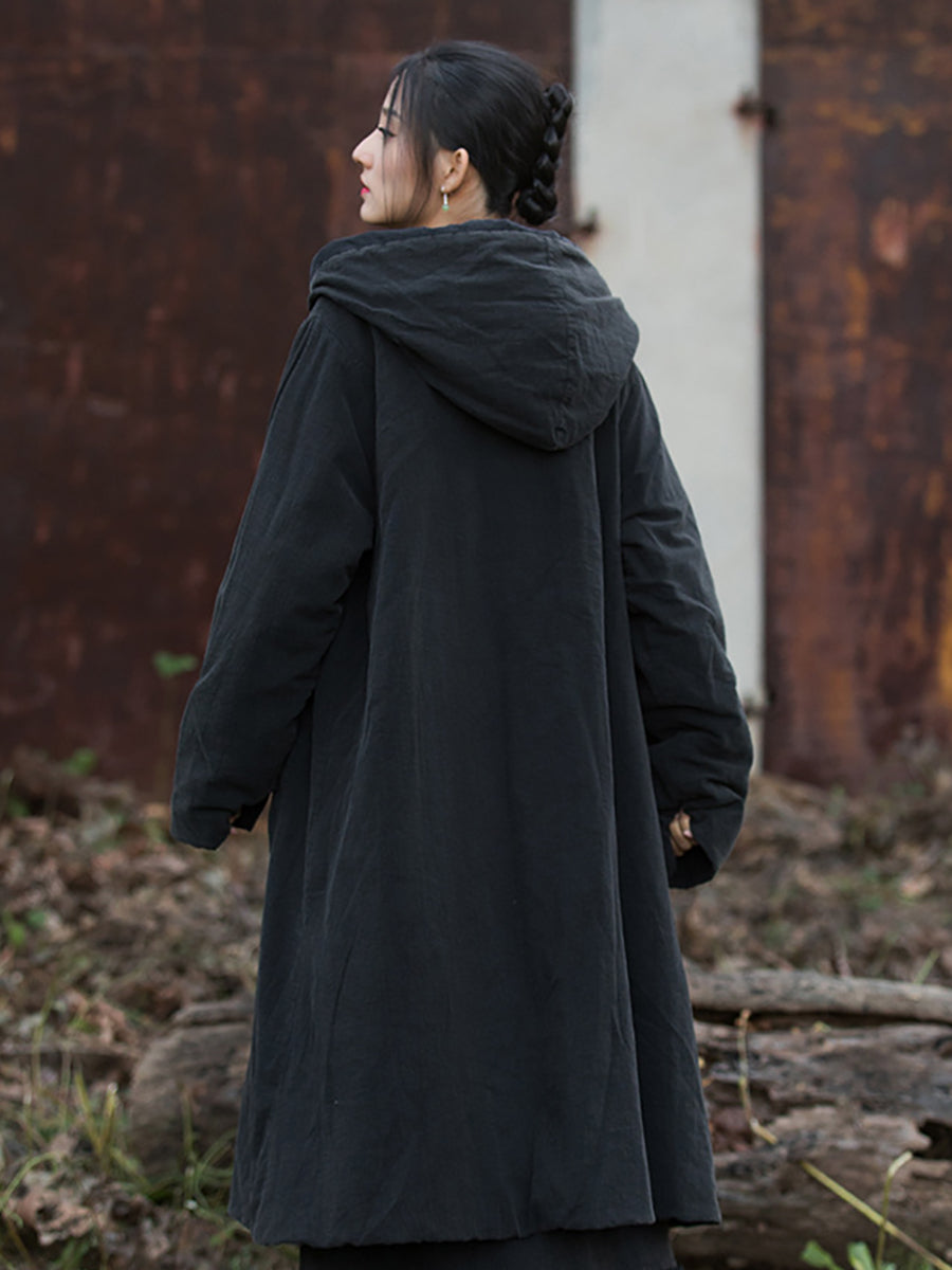 This coat features a solid pattern with a hooded collar and full-length sleeves. The sleeves are of a regular and vintage style and the coat is perfect for the autumn and winter season.