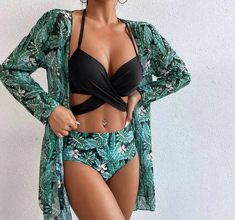 women's sexy leaves flower printing 3 piece set bikinis