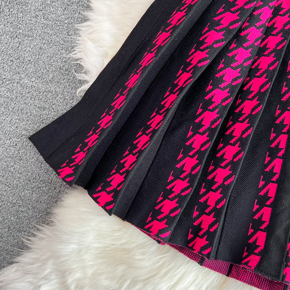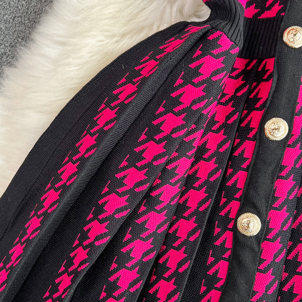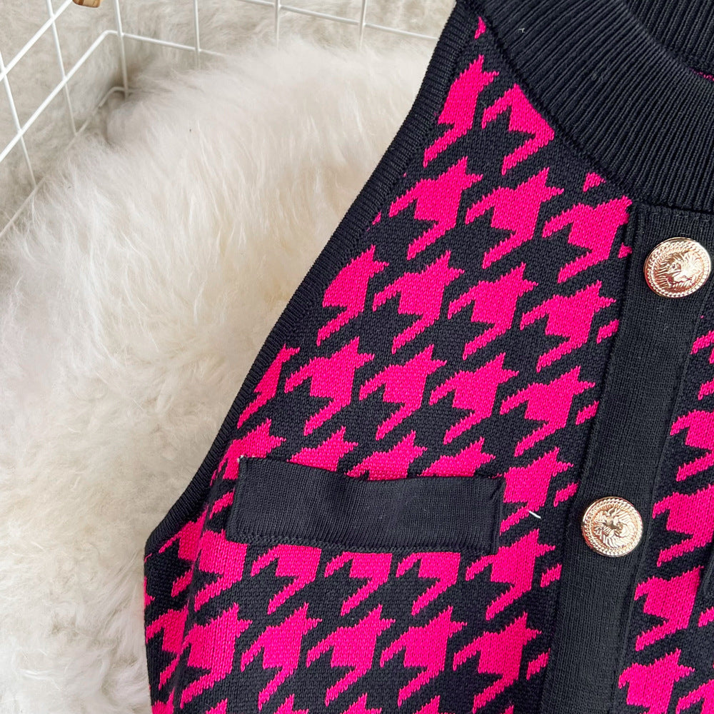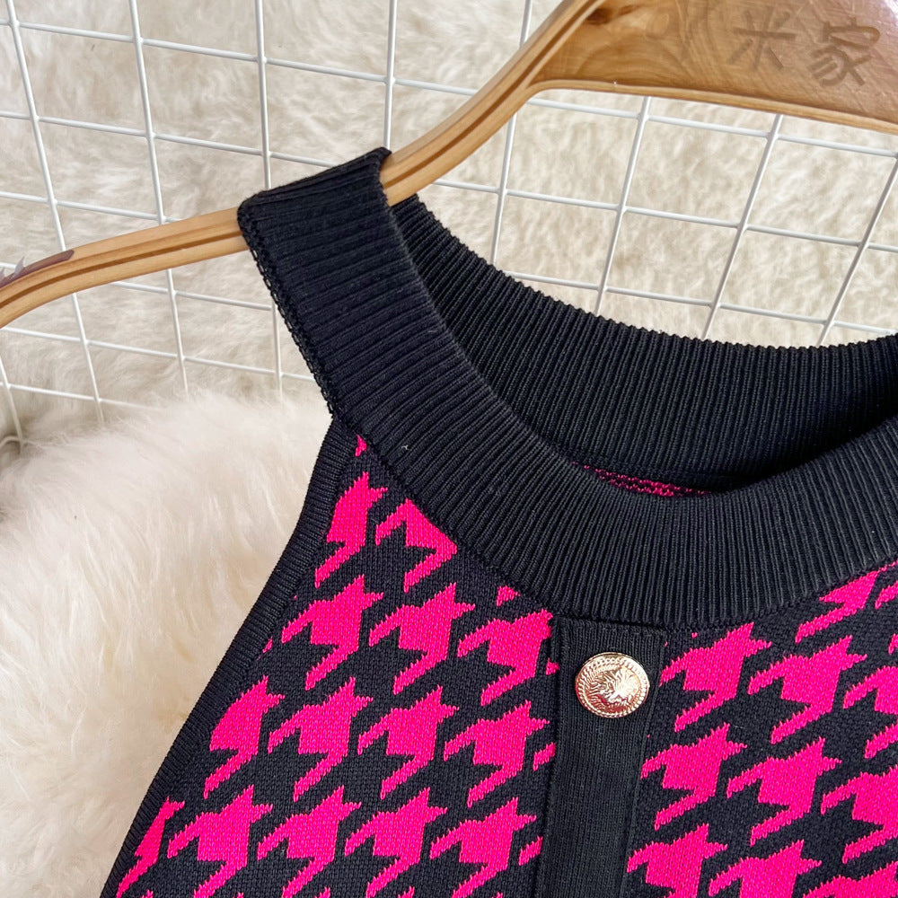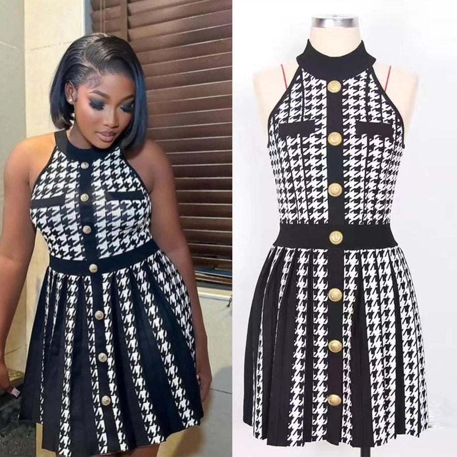 Women's Sheath Dress Elegant Round Neck Button Sleeveless Houndstooth Above Knee Daily
