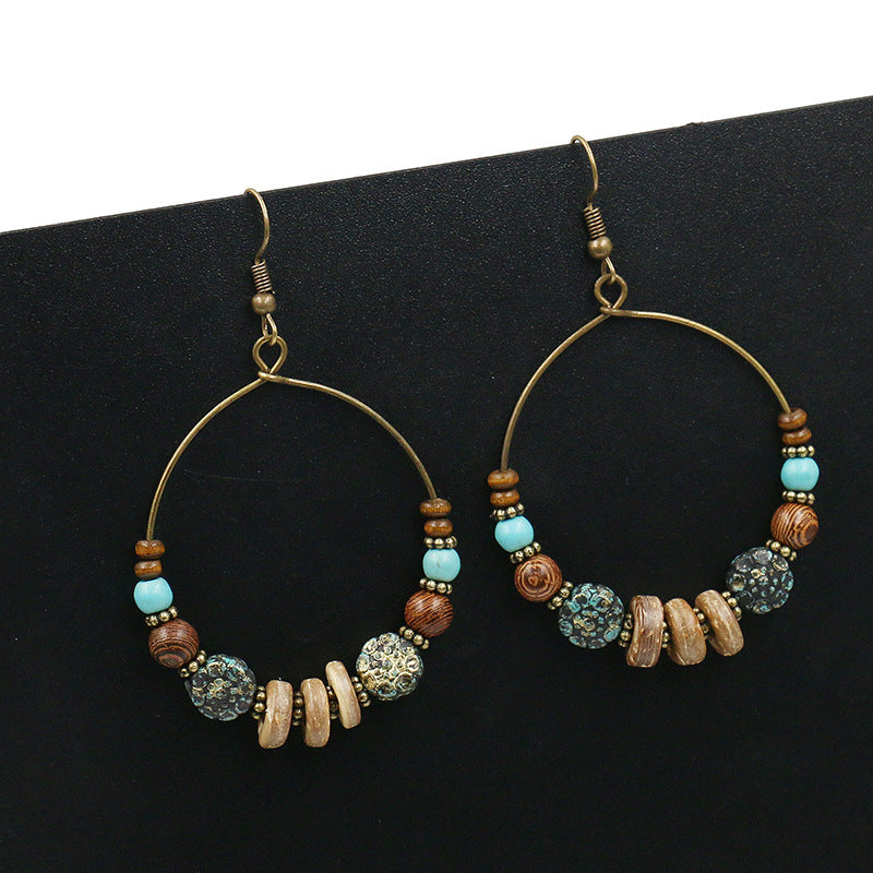Wooden beaded turquoise large ring metal earrings