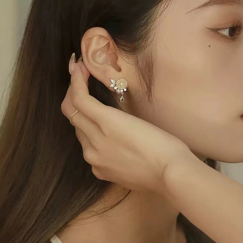 Zircon pearl flower S925 silver needle earrings
